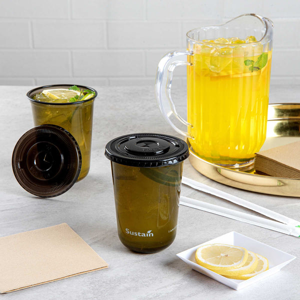 Complement your cups with our Sustain Round Black PLA Plastic Flat Lids. Designed to fit 12, 16, and 24 oz cups, these biodegradable plastic lids provide an impeccable fit. Made from durable, commercially compostable PLA plastic that doesn't contain BPA, these flat lids maintain their functional integrity even in active use. The black finish of these round plastic lids adds a sophisticated touch to your beverage experience. Measuring 3.5 inches in diameter, these round plastic lids offer practical uses and ensure the freshness of your drink. Cups are available and sold separately. Sold in a 100 count box. These items will only degrade outside of the traditional solid waste stream. NOTE: Store and use under 105F. Avoid prolonged exposure to direct sunlight. Suitable for cold beverages only.