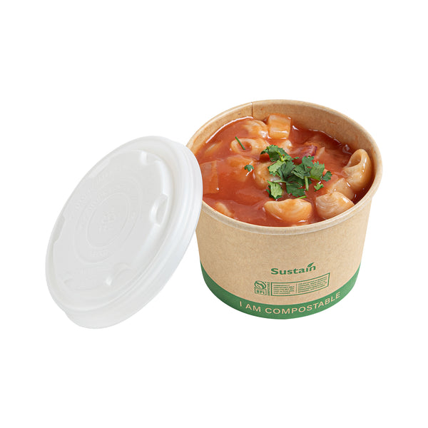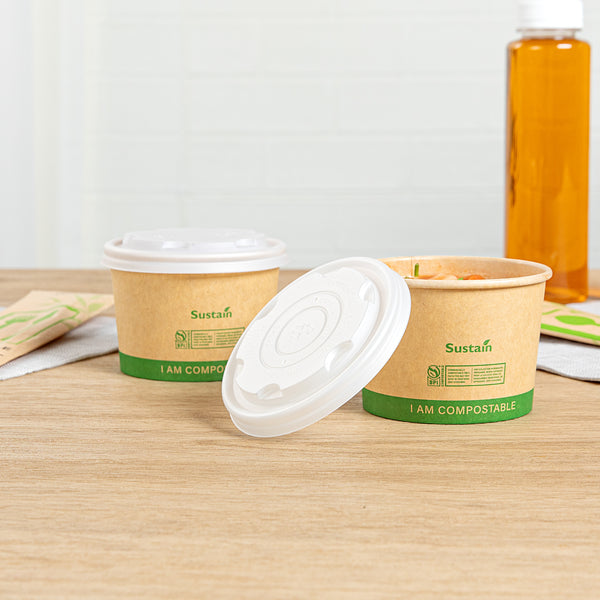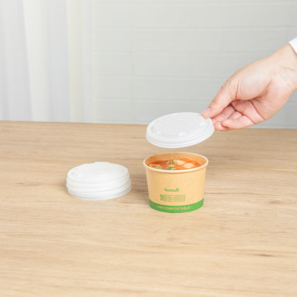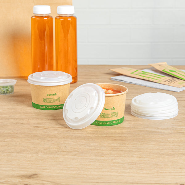 Enhance the convenience of your food service operations with our Sustain Round White PLA Plastic Lids, apt for ensuring a seamless and leak-proof transport. These disposable lids feature a tight-fitting design, allowing them to snap securely onto compatible cups (SKU: RWA1772K), making them excellent soup container lids. Made from PLA plastic derived from cornstarch, these lids are sustainable, providing an alternative solution for your business. The vented design of these white lids allows built-up moist air to escape, preserving the freshness and quality of the contents. Measuring 3.54 inches in diameter, these PLA lids offer a precise fit for a variety of containers. Sold in a 25 count box.