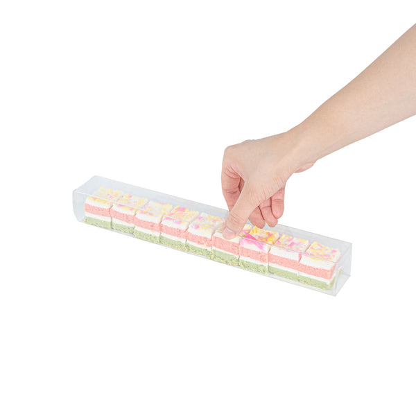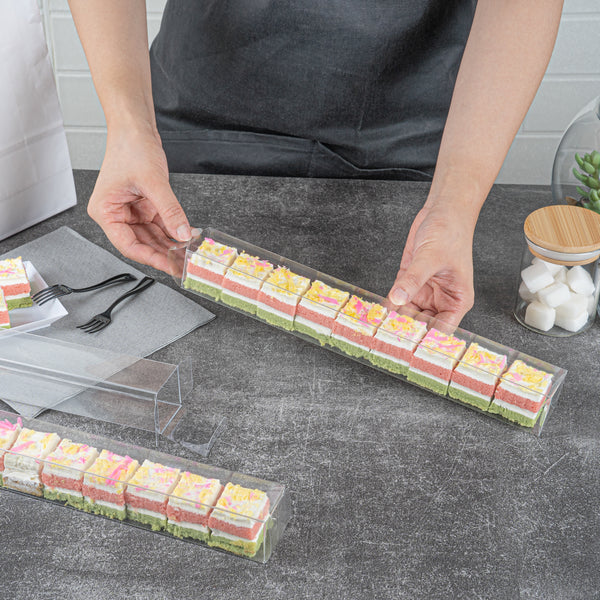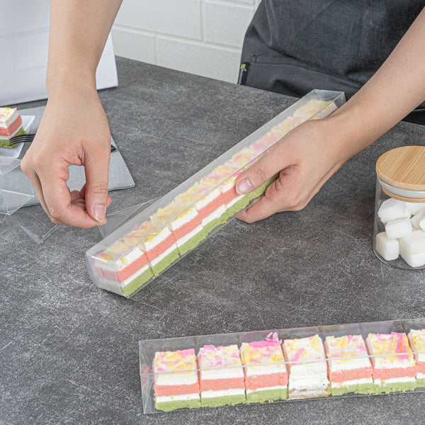 Protective film allows you to fill boxes without having to worry about leaving fingerprints or scratches behind. Simply peel off the film after packaging to reveal a spotless dessert display.