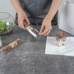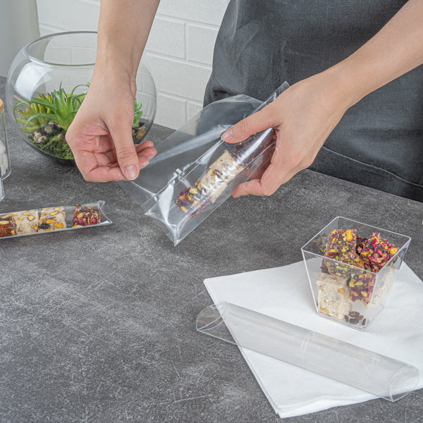 Protective film allows you to fill boxes without having to worry about leaving fingerprints or scratches behind. Simply peel off the film after packaging to reveal a spotless dessert display.