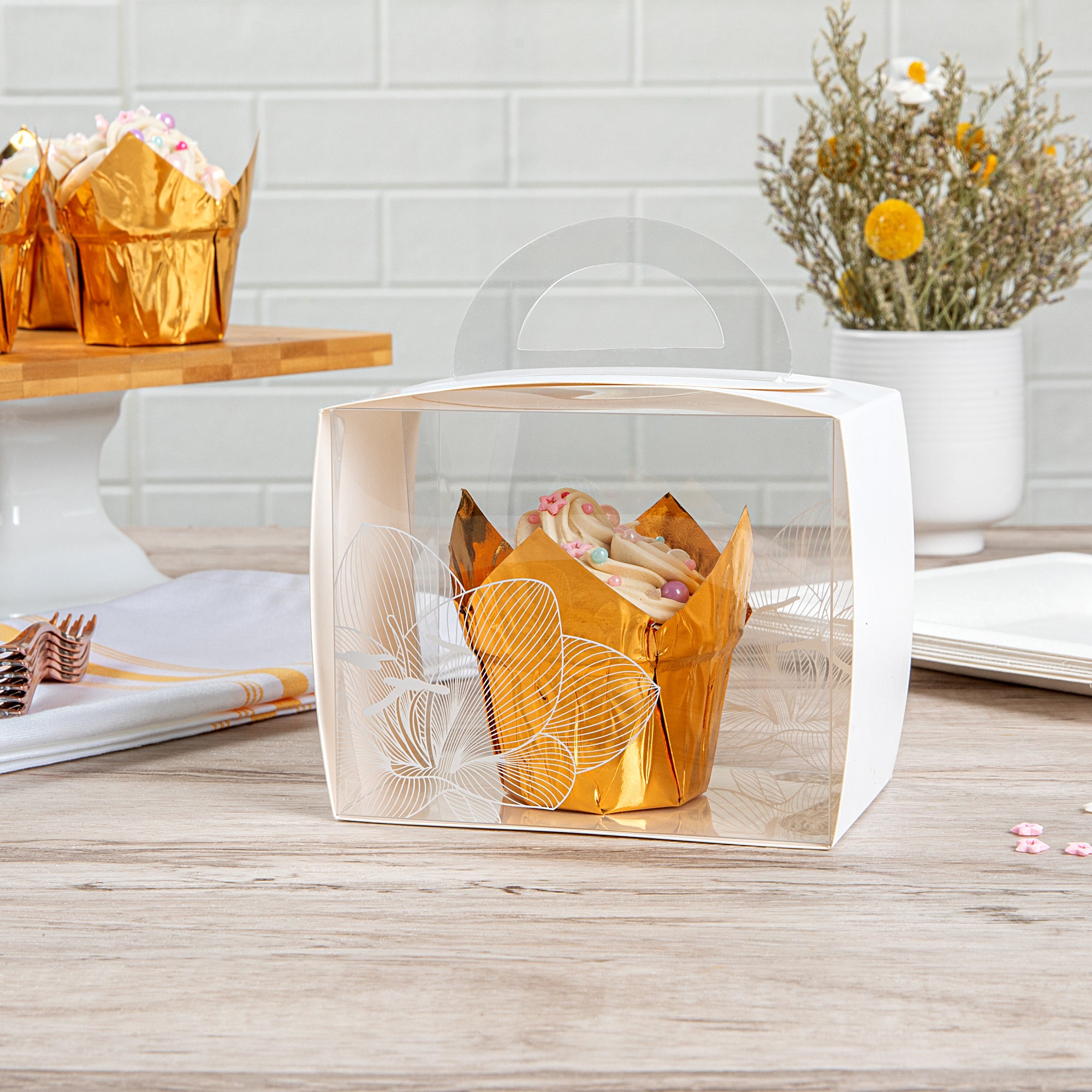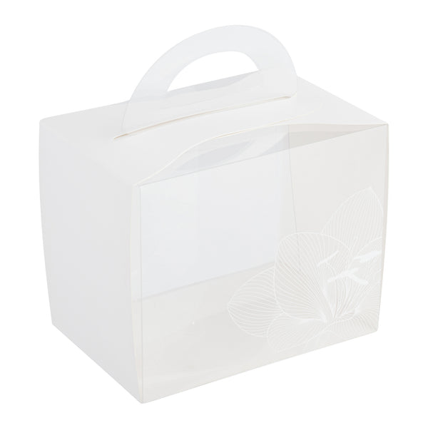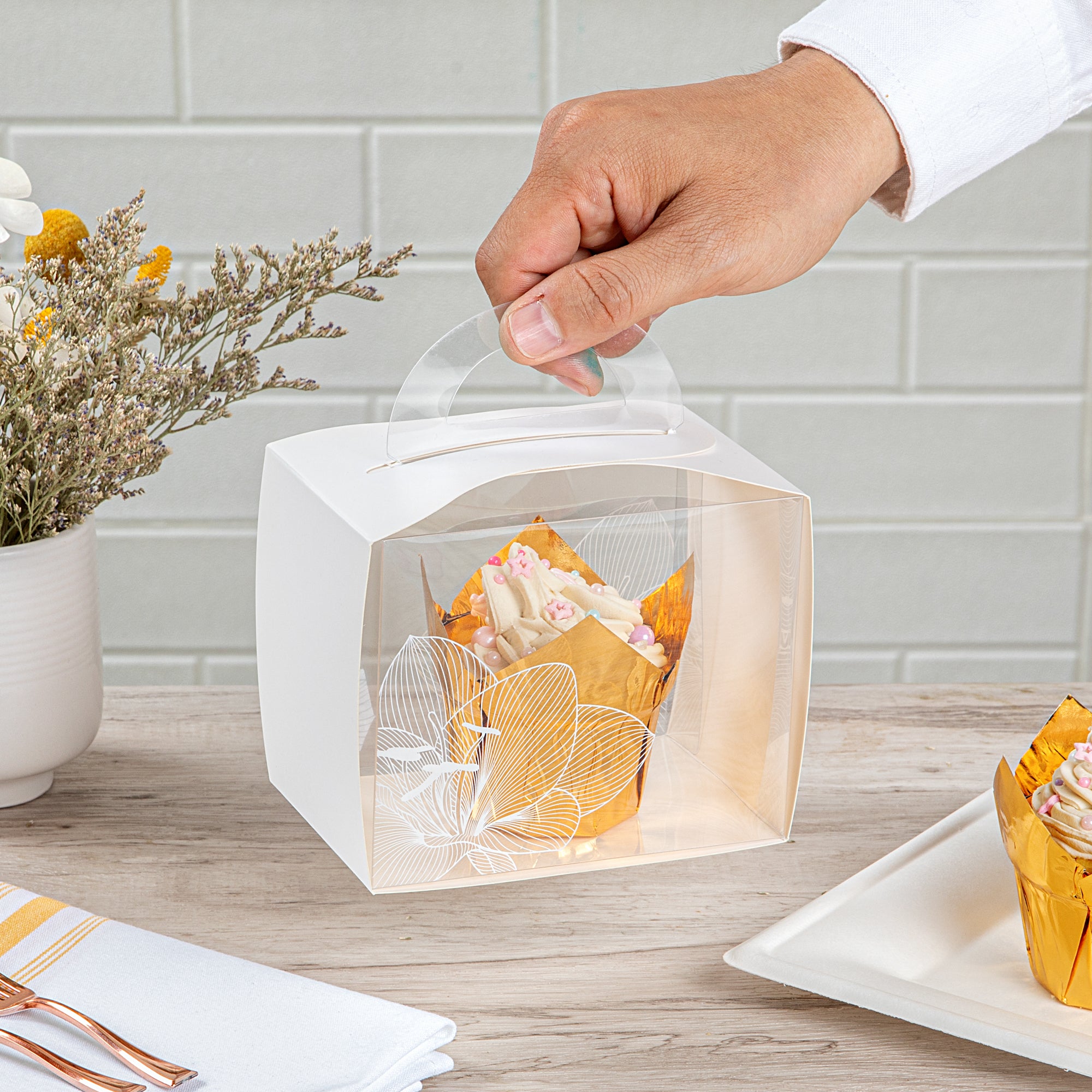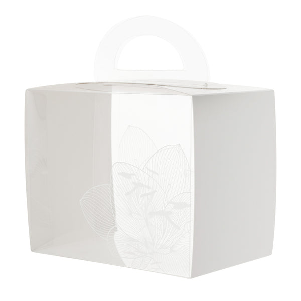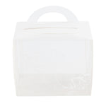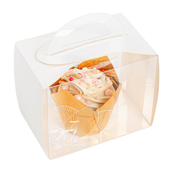 PLASTIC CUPCAKE BOX - WITH HANDLE, WHITE PAPER WRAP, LOTUS ACCENT