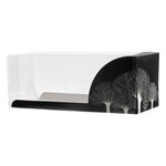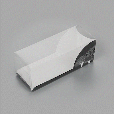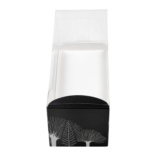 RECTANGLE CLEAR PLASTIC ECLAIR BOX - BLACK PAPER SLEEVE, TREE ACCENT
