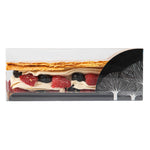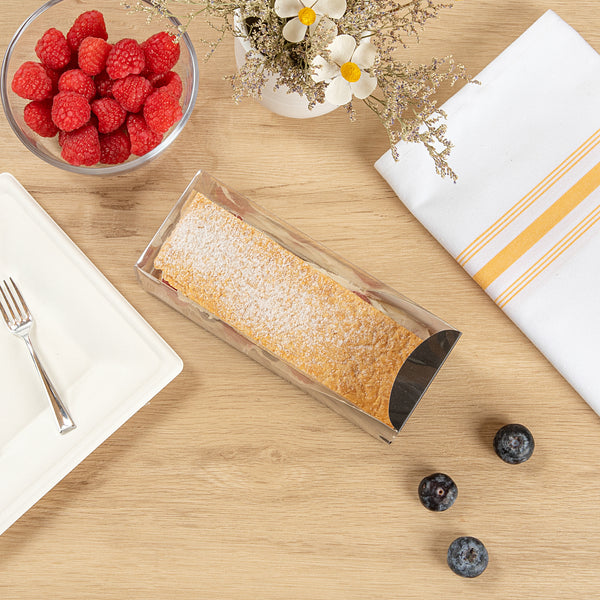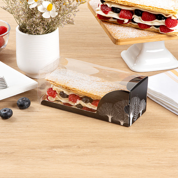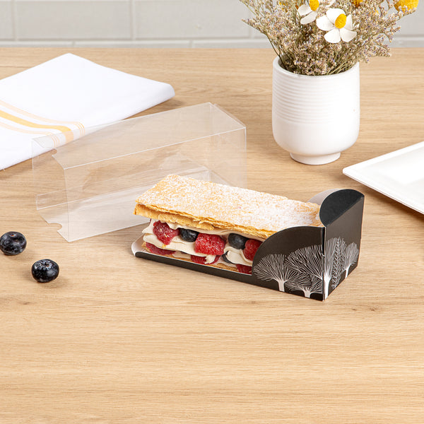 Pack up lemon loaf cakes and other treats using our Sweet Vision Black Rectangle Clear Plastic Eclair Boxes. Featuring a sleek black bottom and a chic tree accent, these small cake boxes instantly add a stylish touch to pastries and capture the attention of guests. These clear dessert boxes have greaseproof paper liners that ensure desserts stay fresh and don't stick to the base. With easy-to-open flaps, these small pastry boxes are perfect for streamlining the packaging process at your bakery, restaurant, or cafe. These bakery boxes have a see-through top that seamlessly showcases the vibrant colors of baked goods. Constructed from PET plastic, these small cake boxes are naturally crack-resistant for a mess-free way to transport desserts. These disposable dessert boxes are shipped flat and unassembled for space-efficient storage in your storage room or prep area. Measuring 7 inches in length by 2.5 inches in width, these clear dessert boxes are excellent for packaging mini cakes or pastries. Sold in a 100 count box.
