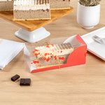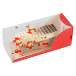 Effortlessly make desserts stand out with our Sweet Vision Red Rectangle Clear Plastic Eclair Boxes. Featuring a bright red finish and a stylish floral and bird print, these plastic cake boxes bring a touch of elegance to your delectable desserts. These plastic pastry containers have greaseproof paper liners on the base to prevent messes and sweets from getting soggy. With easy-to-open flaps, these clear bakery boxes provide employees with a hassle-free way to package take out or delivery orders. These small pastry boxes have a see-through top that expertly showcases your decorated baked goods. Constructed from premium PET plastic, these disposable dessert boxes are naturally crack-resistant to maintain their high-quality look during transport. Measuring 7 inches long by 2.5 inches wide, these plastic cake boxes are shipped flat and unassembled for simple storage at your foodservice establishment. Available in a 100 count box.
