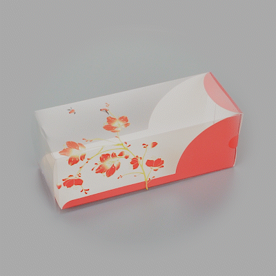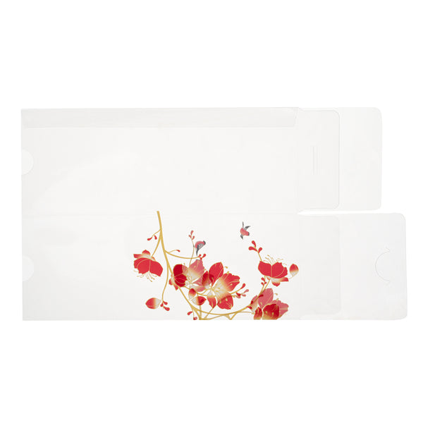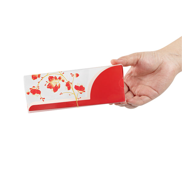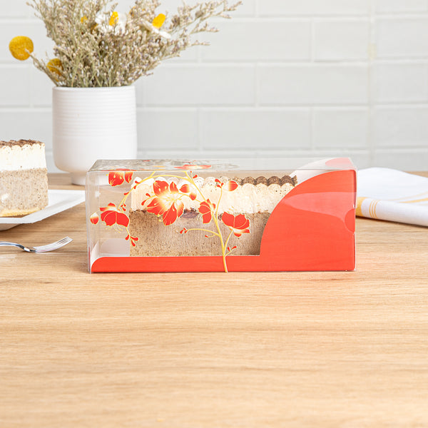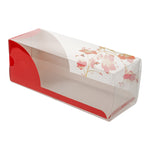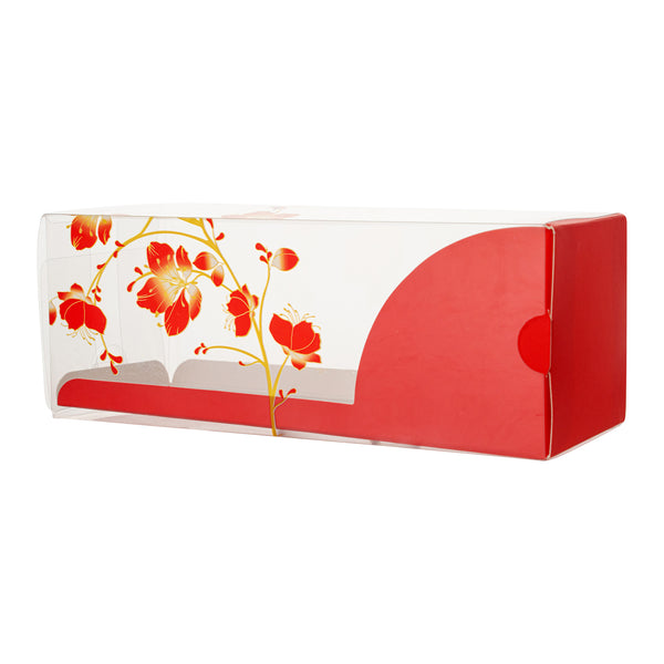 CLEAR PLASTIC ECLAIR BOX - RED PAPER SLEEVE, FLOWER / BIRD ACCENT