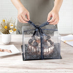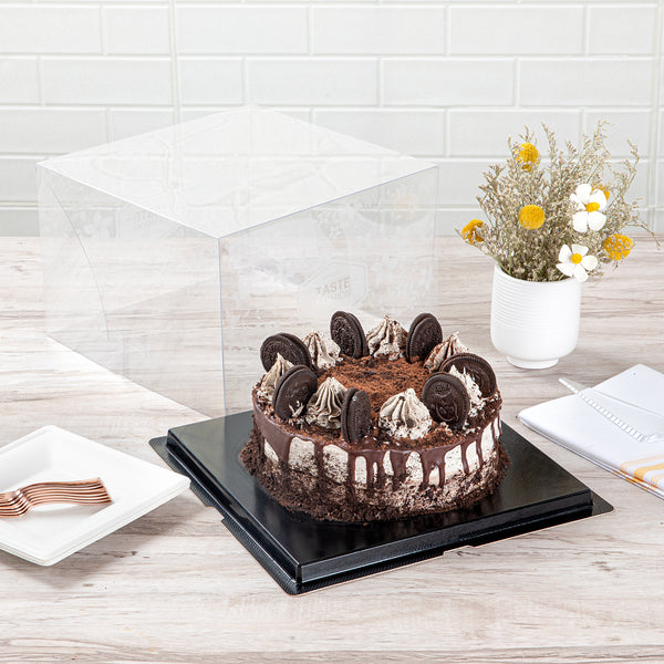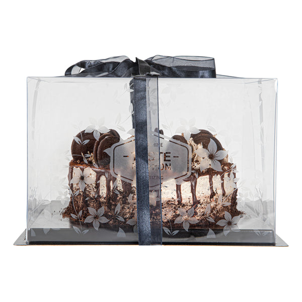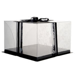 PLASTIC CAKE BOX - BLACK BASE, BLACK RIBBON, FLOWER GARDEN DESIGN