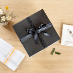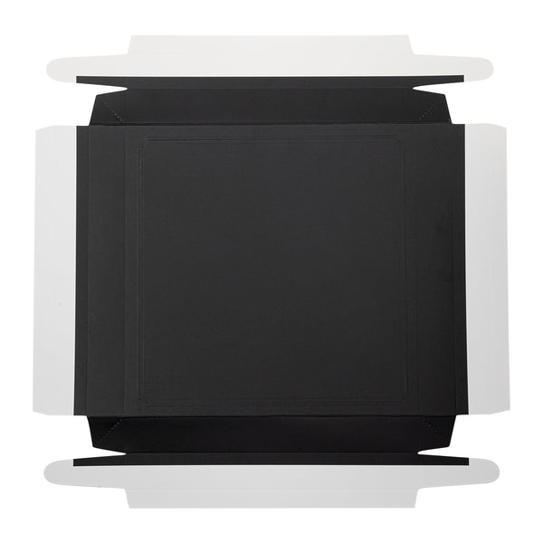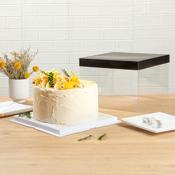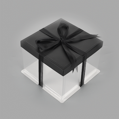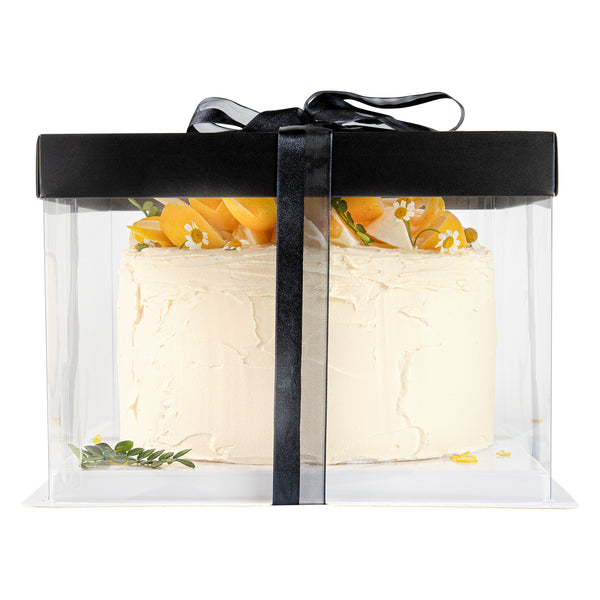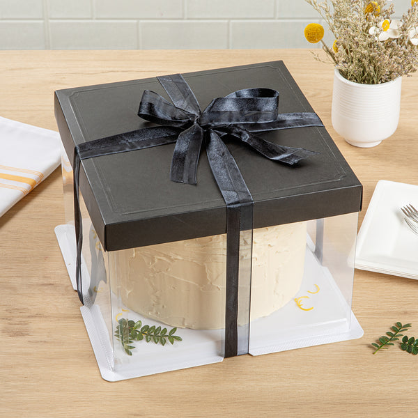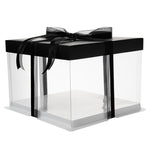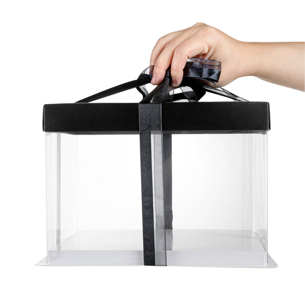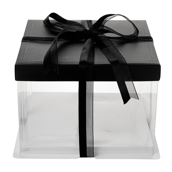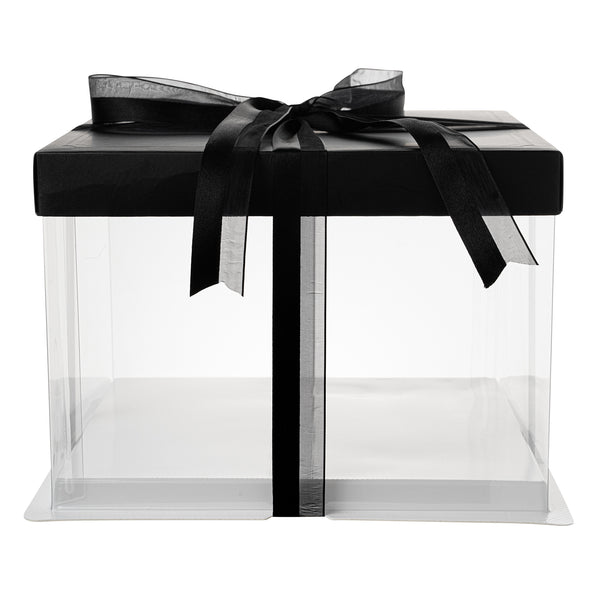 SQUARE CLEAR PLASTIC CAKE BOX - BLACK LID AND WHITE BASE, BLACK RIBBON