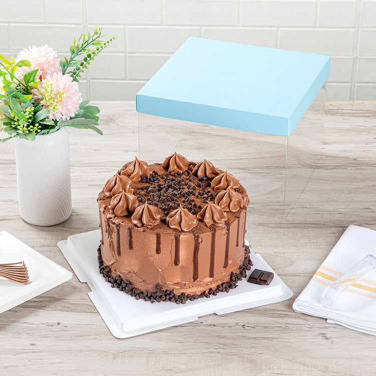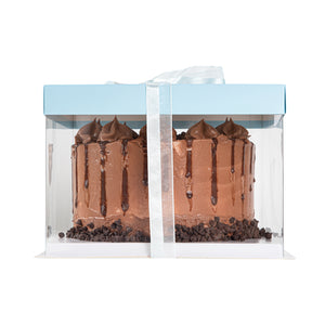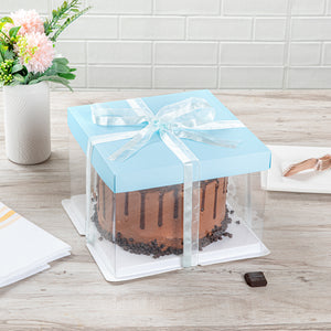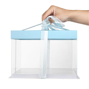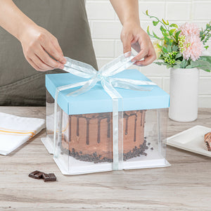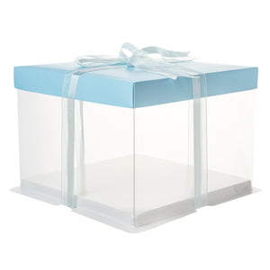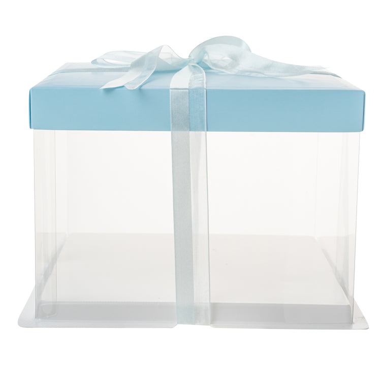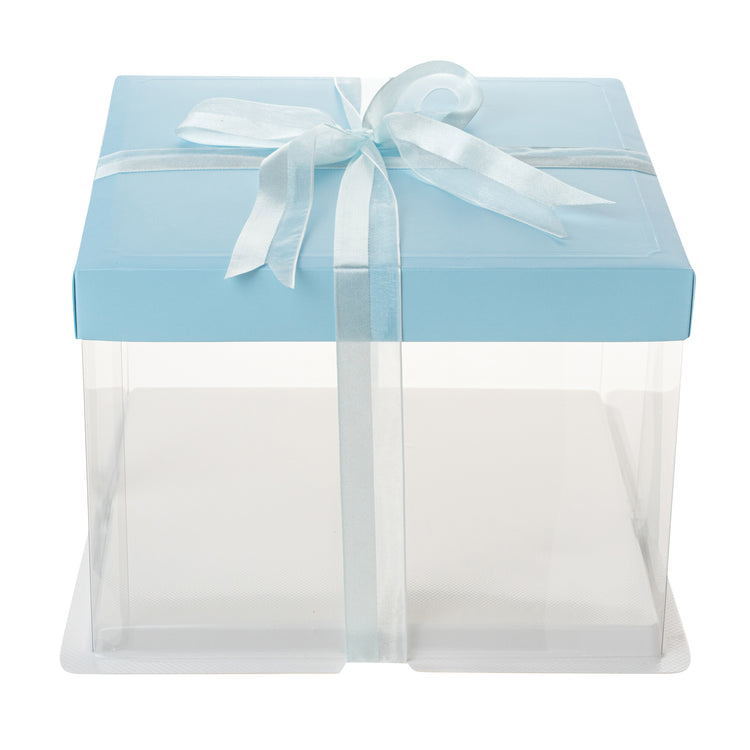 SQUARE CLEAR PLASTIC CAKE BOX - BLUE LID AND WHITE BASE, BLUE RIBBON