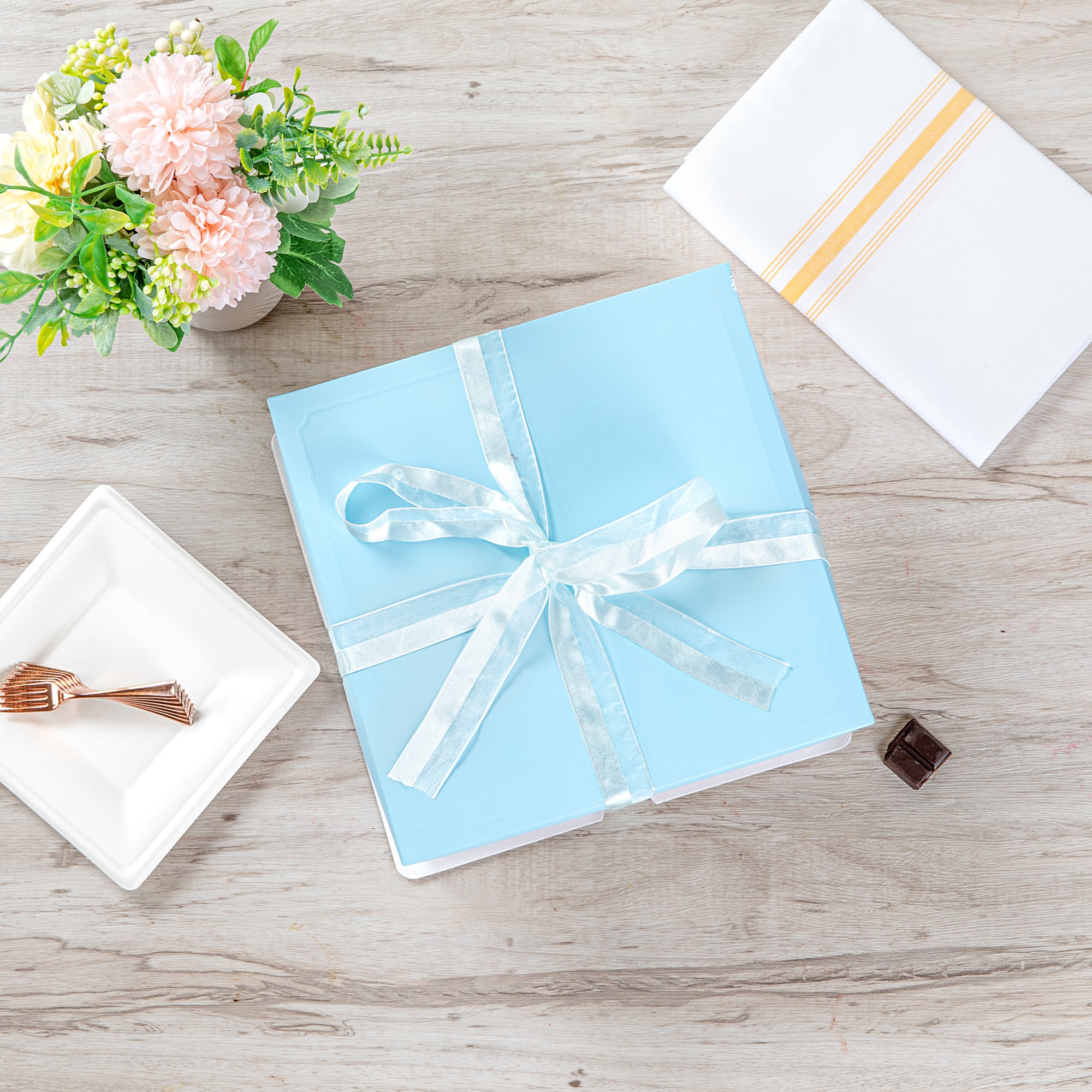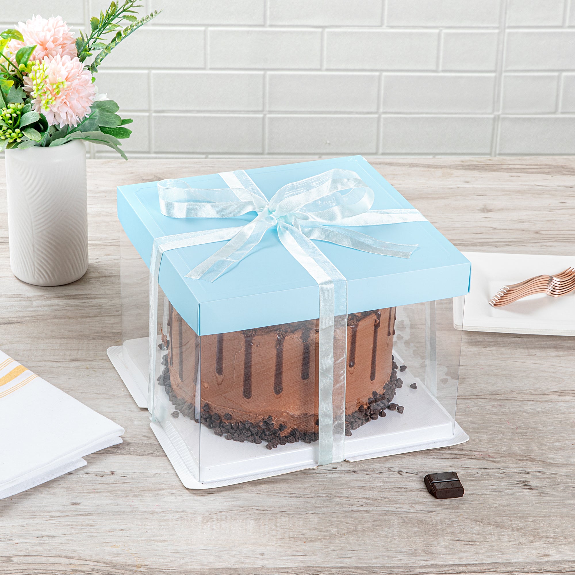Every order includes 10 bases, 10 lids, 10 plastic containers, and ribbon, providing you with all the essentials to easily build your cake boxes. Conveniently package all types of baked goods for special occasions.
