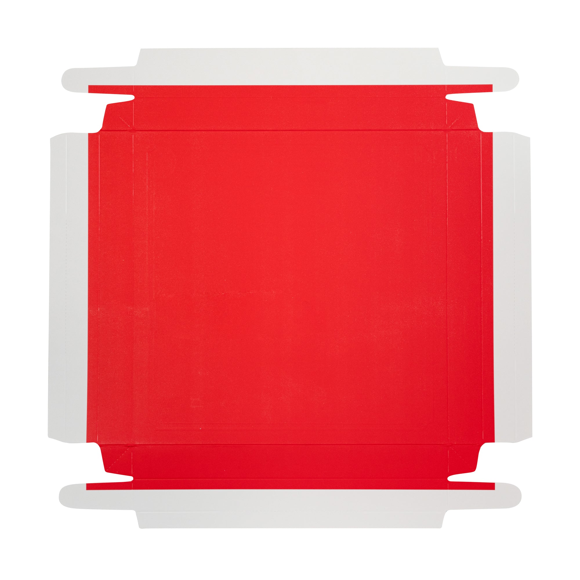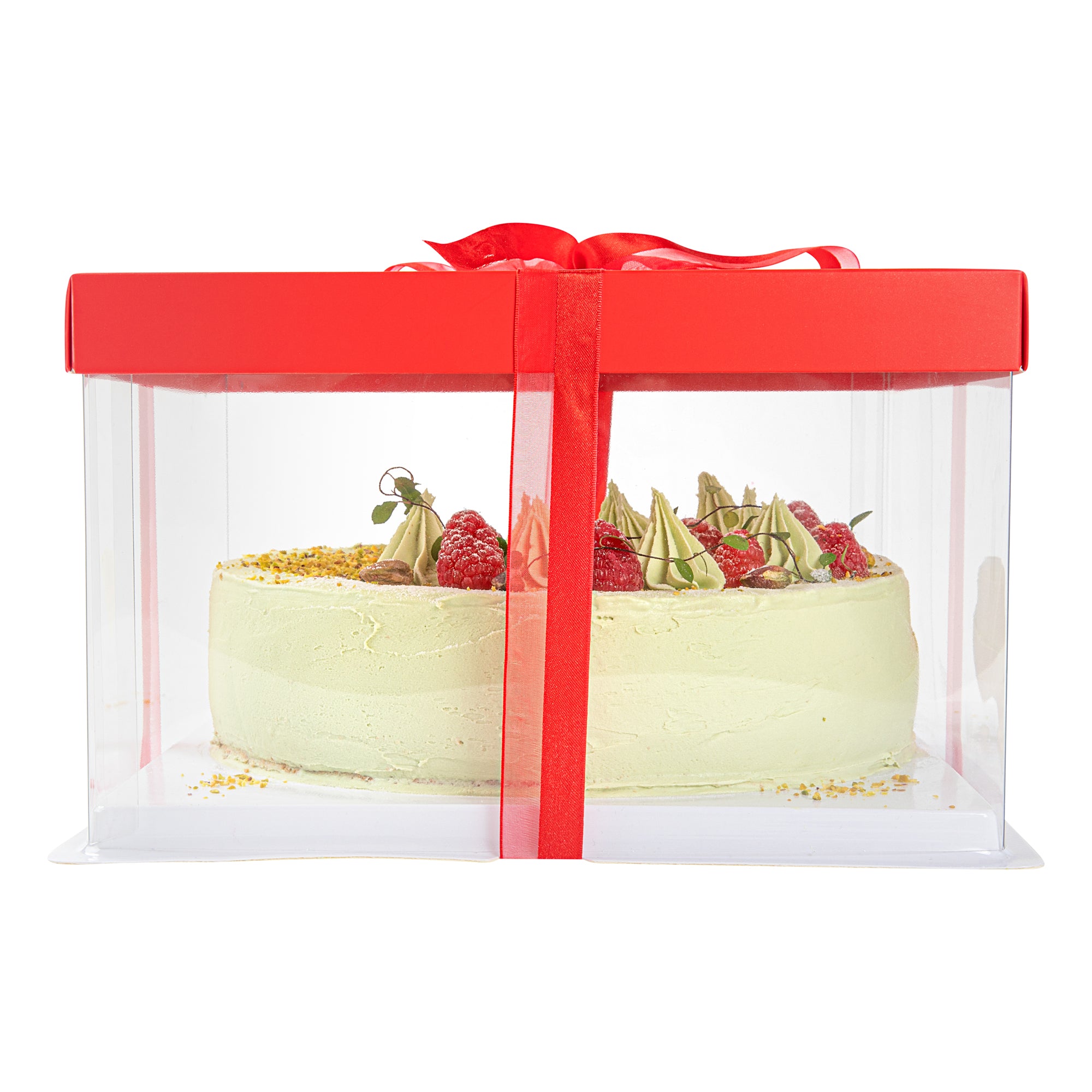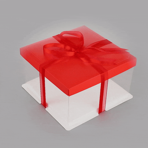 SQUARE CLEAR PLASTIC CAKE BOX - RED LID AND WHITE BASE, RED RIBBON