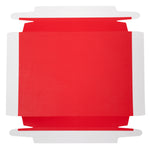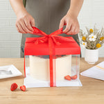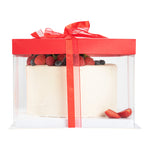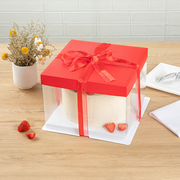 SQUARE CLEAR PLASTIC CAKE BOX - RED LID AND WHITE BASE, RED RIBBON