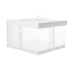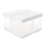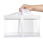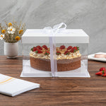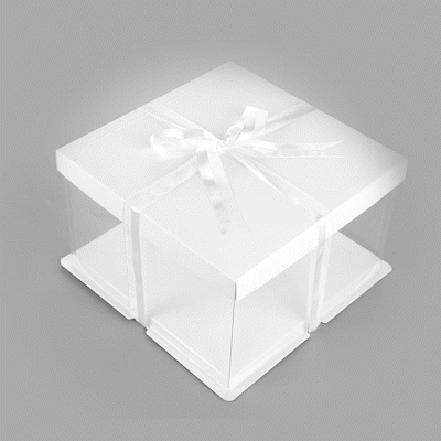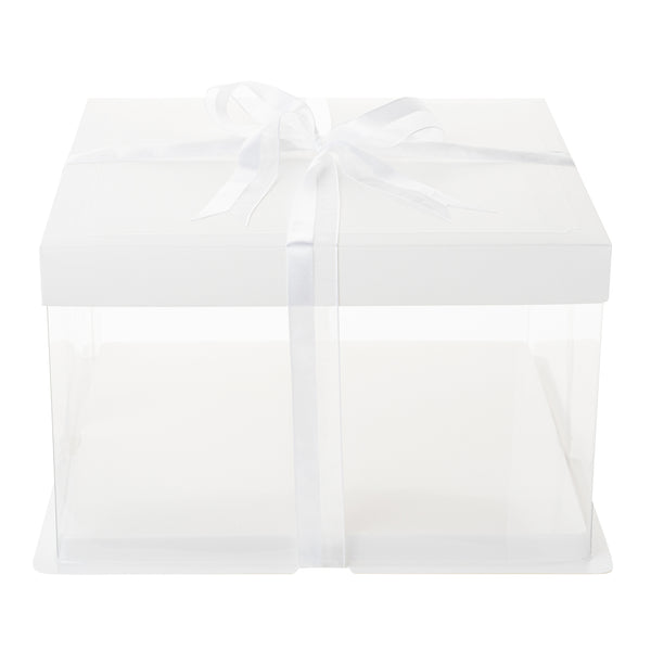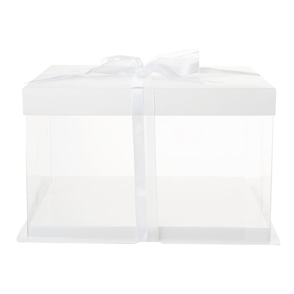 SQUARE CLEAR PLASTIC CAKE BOX - WHITE LID AND WHITE BASE, GRAY RIBBON