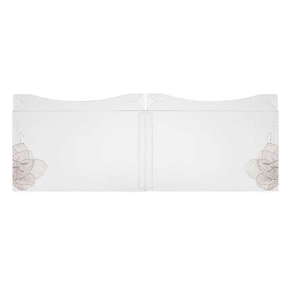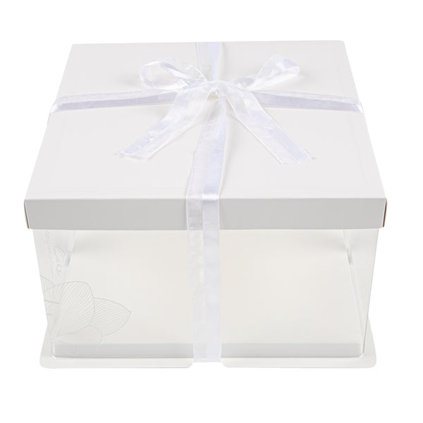 PLASTIC CAKE BOX - WHITE LID AND WHITE BASE, GRAY RIBBON, LOTUS ACCENT