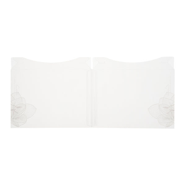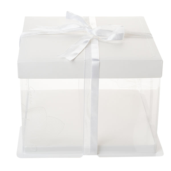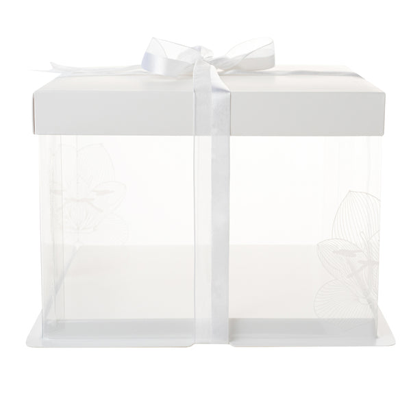 PLASTIC CAKE BOX - WHITE LID AND WHITE BASE, GRAY RIBBON, LOTUS ACCENT