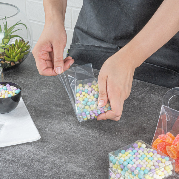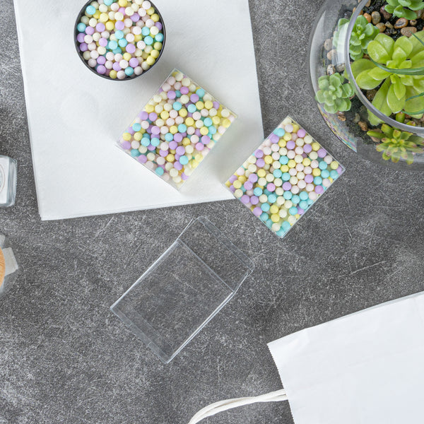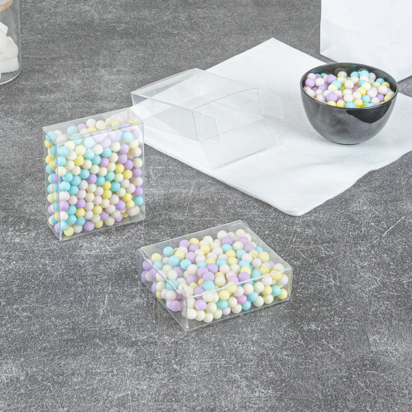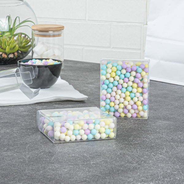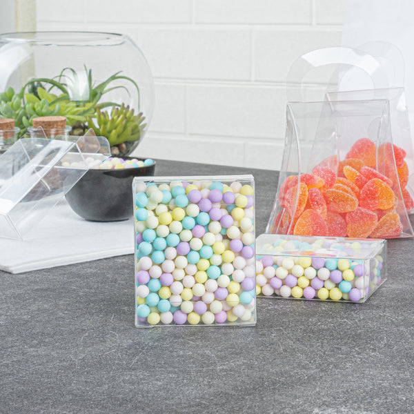 Our candy boxes are crystal clear so your guests can easily see their sweets or party favors in each box. Show off your colorful candies or delicious baked goods!
