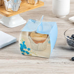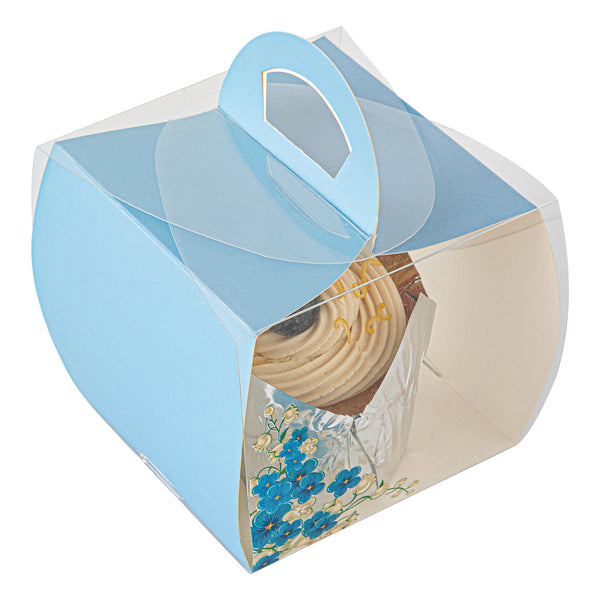 PLASTIC CUPCAKE BOX - WITH HANDLE, BLUE PAPER WRAP, FLOWER ACCENT