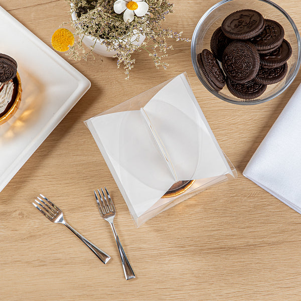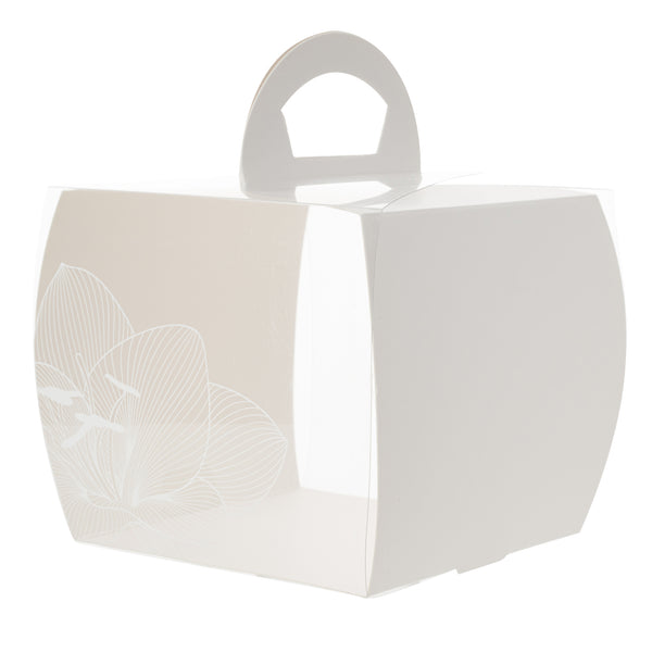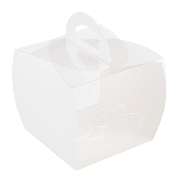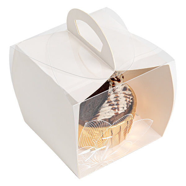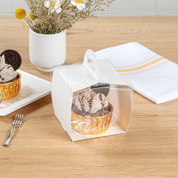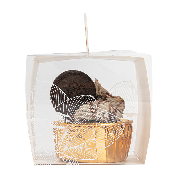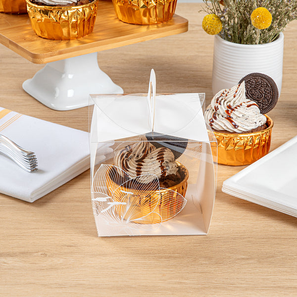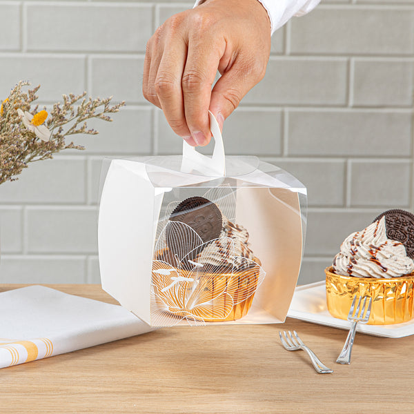Create elegant displays of your signature baked goods with these Sweet Vision Square Clear Plastic Cupcake Boxes. The beautiful lotus flower design of these transparent cupcake boxes draws customers' eyes to your puff pastries, macarons, and cupcakes. Featuring a built-in handle, these cupcake treat boxes make it easy to transport your delivery orders to customers' homes or venues. Perfect for buttery and rich desserts, these decorative cupcake boxes are grease-resistant and don't need to be lined with baking paper when packaging your sweets. Equipped with a white paper wrap, these cupcake to go boxes safely keep your baked goods inside the box to prevent messy accidents. These disposable cupcake containers are specially made to quickly package orders and speed up your service. These white cupcake boxes are shipped flat for space-saving storage at your cafe, diner, bakery, or catering service. Measuring 4 inches in length by 4 inches in width by 4.25 inches in height, these small pastry boxes are sold in a 100 count box.