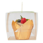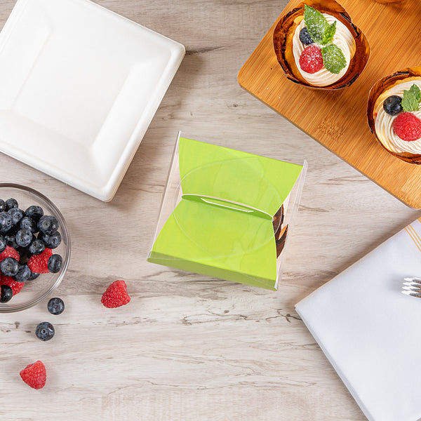 Delight customers with beautiful packaging using these Sweet Vision Square Clear Plastic Cupcake Boxes. Each of these transparent cupcake holders is decorated with stylish geometric lines which give a sleek and modern look to your bakery, cafe, or catered event. Equipped with a built-in handle, these cupcake bakery boxes provide a safe and secure hold while handing out orders to keep boxes from slipping out of employees' hands. Featuring a non-stick base, these cupcake carrier boxes allow you to take out sticky sweets without any hassle. The paper wrap of these decorative cupcake boxes has a bright yellow finish to draw all eyes to your delicious muffins, tarts, cupcakes, or macarons. These yellow cupcake boxes are disposable and designed for single-use, making them perfect for customers celebrating special events. These muffin gift boxes are shipped flat for space-saving storage and can be easily folded and assembled. Measuring 4 inches in length by 4 inches in width by 4.25 inches in height, these small pastry boxes are sold in a 100 count box.