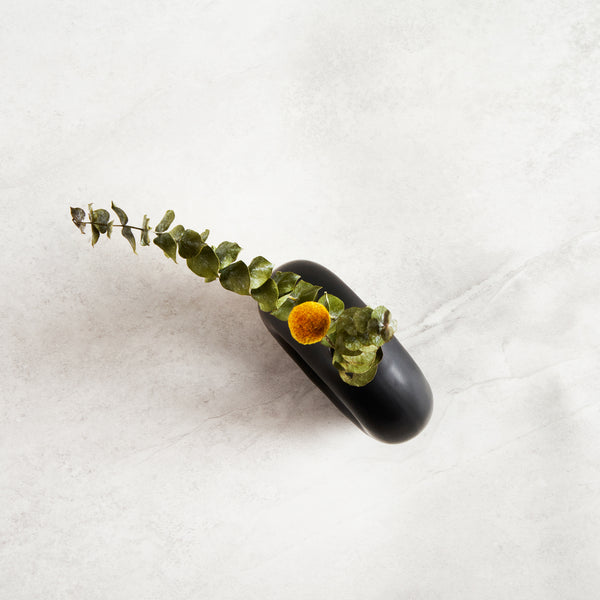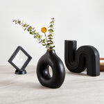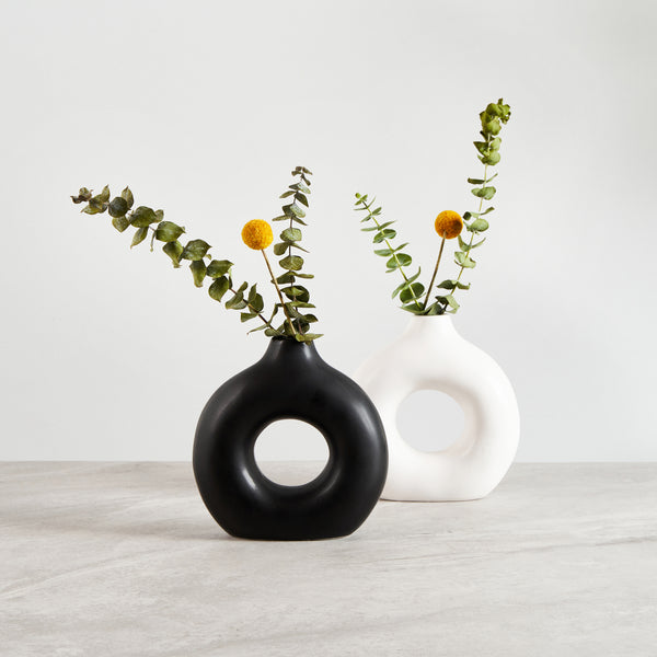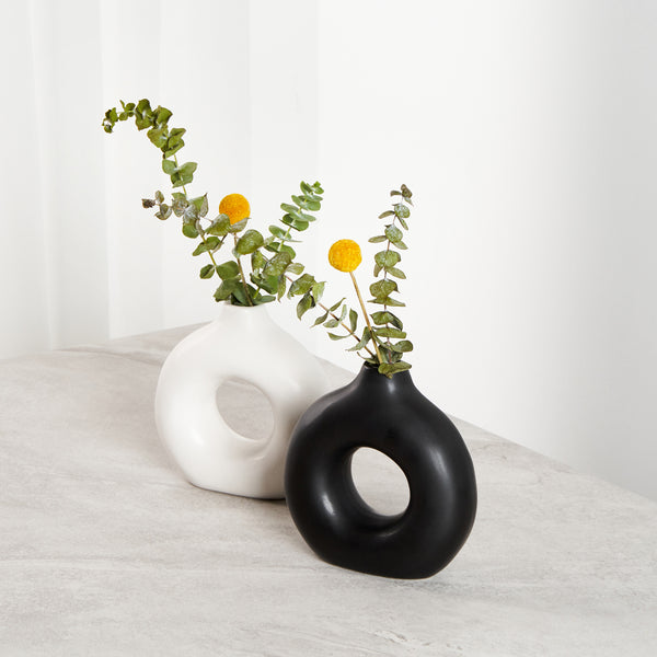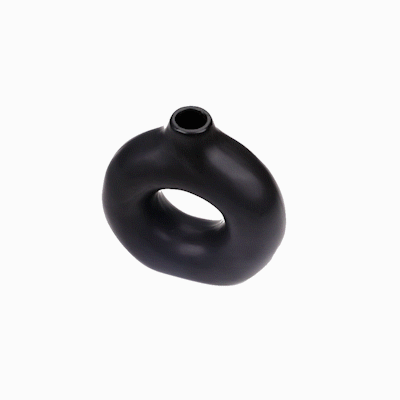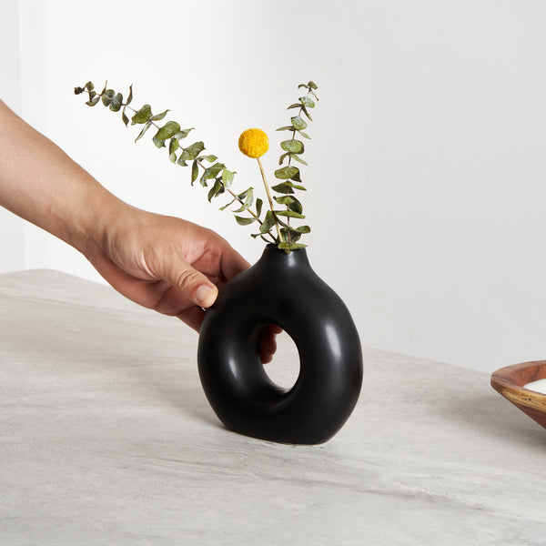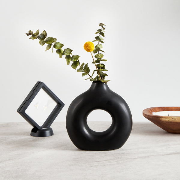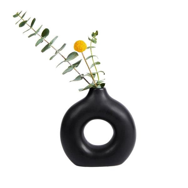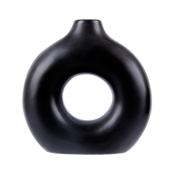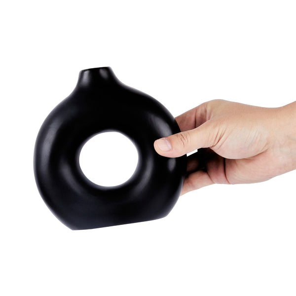 Elevate your decor with our Table Art Black Ceramic Donut Vase. This flower vase features a captivating circular design reminiscent of a donut, adding a playful and modern touch to any room. The elegant black finish of this ceramic vase adds a sophisticated touch to any space, making it a timeless addition to your home decor. Crafted from premium ceramic, this centerpiece vase is durable and sturdy, ideal for maintaining its pristine appearance for years to come. The stable base of this decorative vase reduces the risk of tipping over and ensures your beautiful floral arrangements remain securely in place. Perfect for various settings, this donut vase is versatile and complements modern living rooms to chic office spaces. This pottery vase can beautifully showcase flowers and dried arrangements or be an eye-catching decorative piece. To ensure maintenance is a breeze, this black vase can be cleaned with soap and water for easy upkeep. Measuring 5.7 inches in length by 2.1 inches in width by 5.9 inches in height, this black ceramic vase is perfectly sized for various floral arrangements. Sold in a 1 count box.