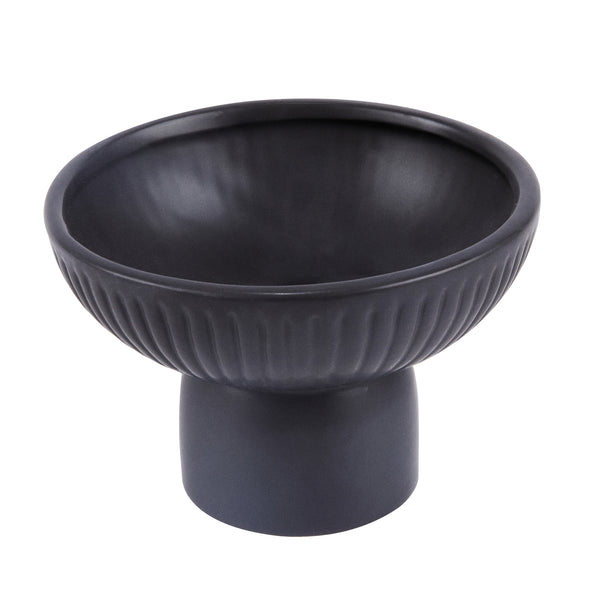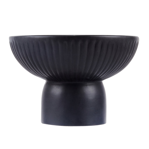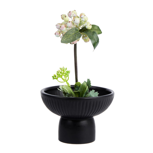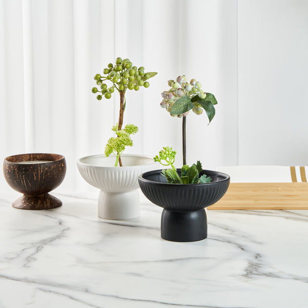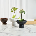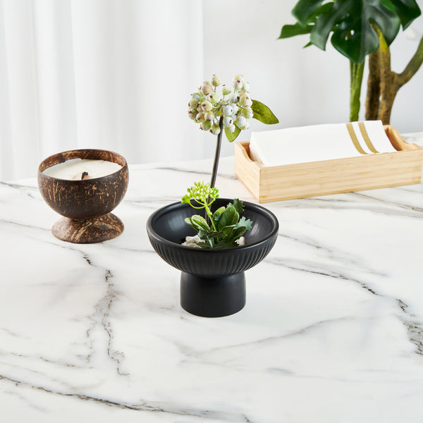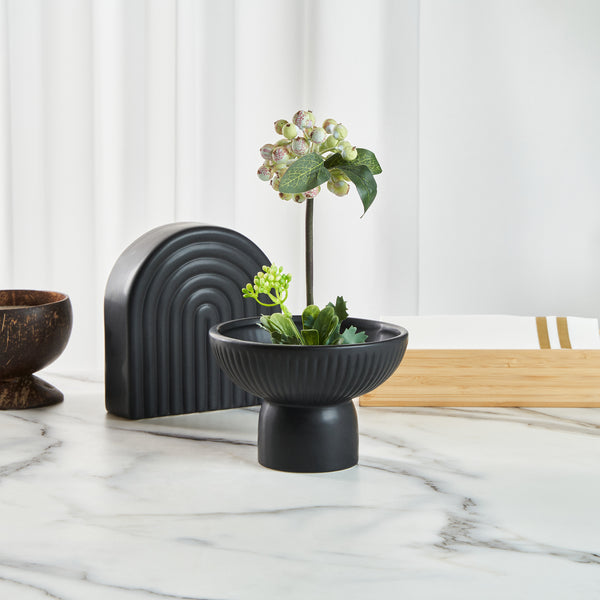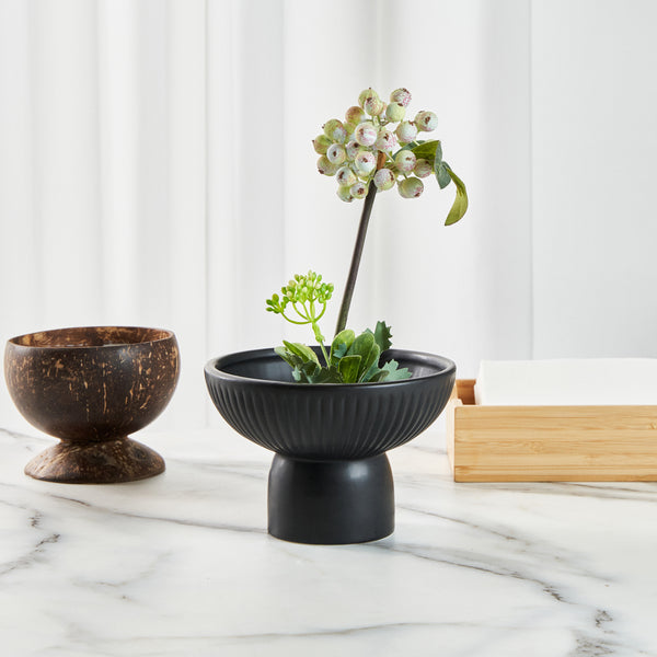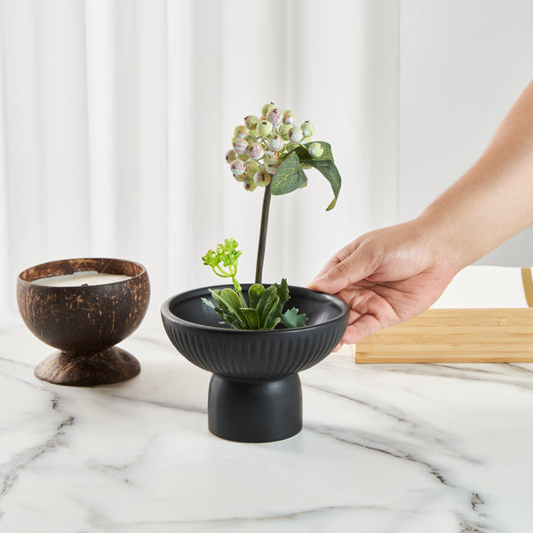 Elevate your decor with our Table Art Black Ceramic Pedestal Vase. The sophisticated pedestal-style design of this ceramic vase creates visual intrigue and elevates your space, making it a striking centerpiece that blends elegance and modernity. With an elevated base, this decorative vase minimizes the risk of tipping to keep your floral arrangements intact. The black finish of this flower vase exudes a sense of modern sophistication and enhances the beauty of any floral arrangement or standalone display. This centerpiece vase is manufactured from premium ceramic for long-lasting durability and sturdiness. Suitable for various settings, this table vase complements traditional and modern decor styles. This black vase is versatile and can be used as a standalone centerpiece or vessel for showcasing your favorite blooms. To maintain its pristine appearance, this black ceramic vase can be hand washed with soap and water for easy upkeep. This black decorative vase measures 6 inches in diameter by 4.1 inches in height. Sold in a 1 count box.