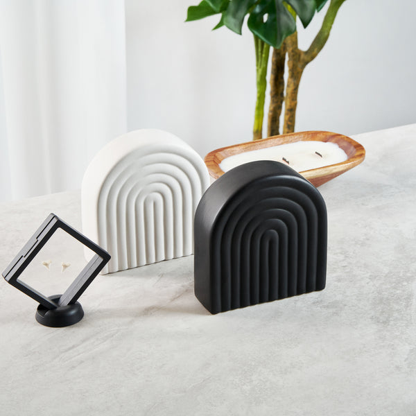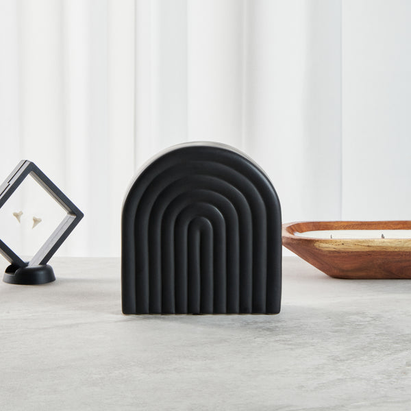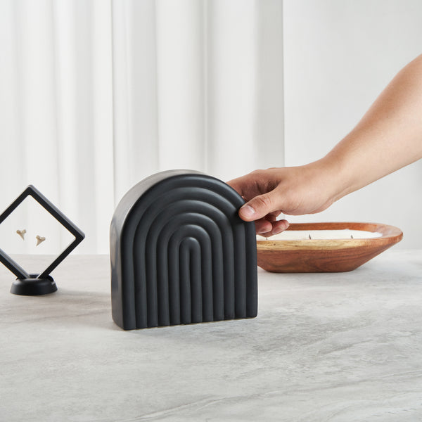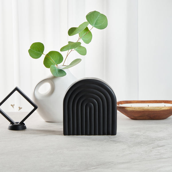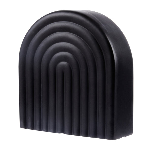 Elevate your space with our Table Art Black Ceramic Rainbow Vase. Uniquely designed, this ceramic vase creates an eye-catching focal point, effortlessly blending contemporary style with artistic flair in any space. The black finish of this flower vase exudes an air of modern sophistication, adding a bold and elegant touch to any floral arrangement or decor ensemble. Made from premium ceramic, this decorative vase is durable and sturdy, making it ideal for long-lasting use in your space. Featuring a stable base, this centerpiece vase reduces the risk of tipping over, ensuring your floral arrangements stay intact. This table vase complements various settings and can be used to enhance the ambiance of your dining rooms or chic offices. The versatile design of this black ceramic vase makes it suitable for use as a standalone centerpiece or for floral and dried arrangements. This black vase can be hand washed with soap and water, making maintenance simple and convenient. Measuring 6.1 inches in length by 2.1 inches in width by 6.3 inches in height, this black flower vase fits perfectly in various settings. Sold in a 1 count box.
