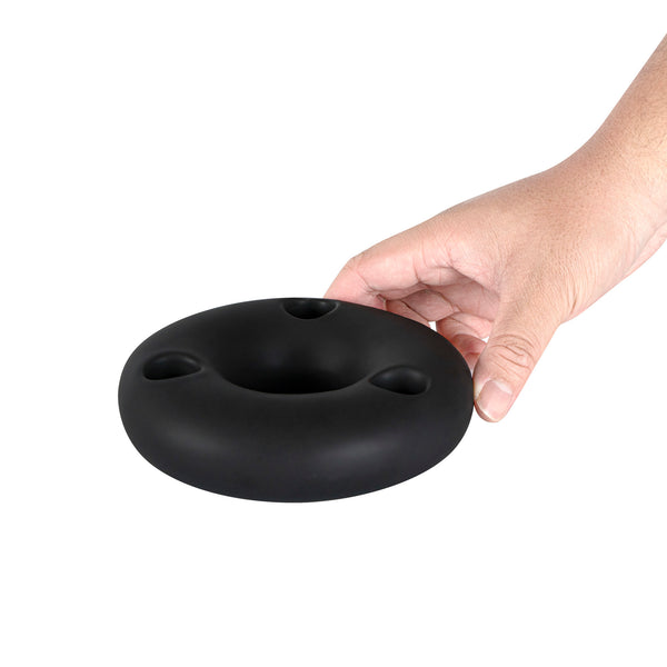 Amplify your decor style with our Table Art Black Ceramic Ring Vase. This ceramic vase boasts an exquisite design with graceful contours that create a striking visual appeal and enhance the elegance of any space. The sleek black finish of this candle holder adds a touch of modern sophistication, making it a stylish piece that enhances any decor. Manufactured from premium ceramic, this decorative vase boasts durability and sturdiness for long-lasting use at your home or office. This table vase effortlessly complements a wide variety of traditional and contemporary decor styles. The versatile design of this black vase allows you to use it as a standalone structural accent. This black ceramic vase can be hand washed with soap and water, facilitating easy upkeep to maintain its pristine appearance. Measuring 6 inches in diameter by 1.75 inches in height, this stylish black vase creates a stunning visual focal point in your space. Sold in a 1 count box.