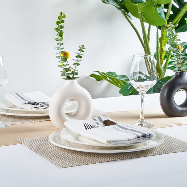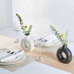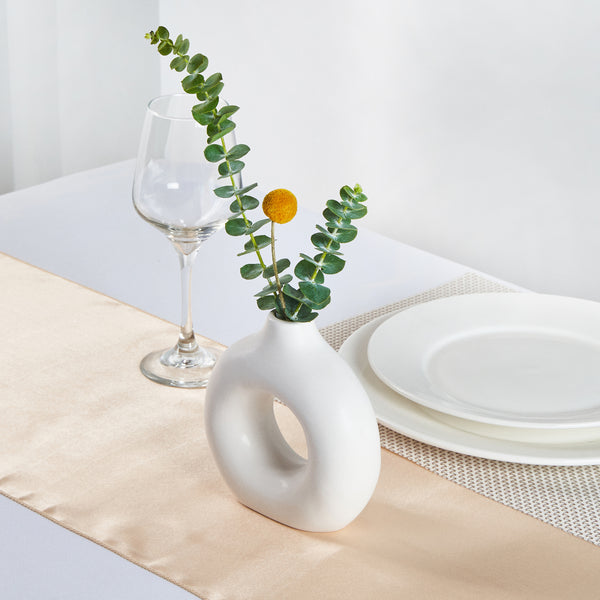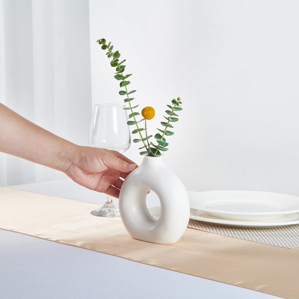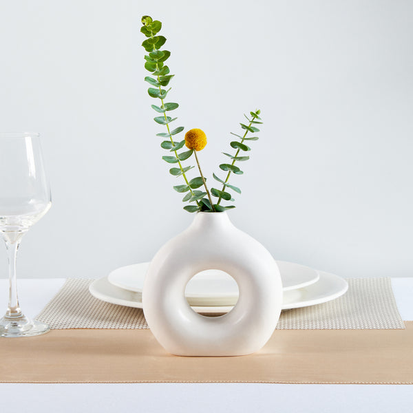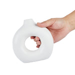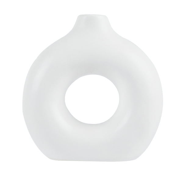 Add a touch of elegance to any space with our Table Art White Ceramic Donut Vase. This ceramic vase is designed with a circular shape reminiscent of a donut, offering a unique and playful aesthetic. Boasting a classic white finish, this flower base adds a touch of elegance and sophistication to any room, effortlessly complementing various decor styles. This decorative vase is crafted from premium ceramic, making it durable and sturdy for long-lasting use at your home or office. The sturdy base of this centerpiece vase minimizes the risk of tipping over, ensuring your floral arrangements remain secure and beautifully displayed. Ideal for a range of settings, this donut vase complements everything from modern living rooms to chic office spaces. This pottery vase offers versatility and can serve as a striking centerpiece or be utilized for arranging flowers. Cleaning this white vase is simple and convenient, as it can be cleaned with soap and water for easy upkeep and maintenance. Measuring 5.7 inches in length by 2.1 inches in width by 5.9 inches in height, this white ceramic vase is perfect for any setting. Sold in a 1 count box.