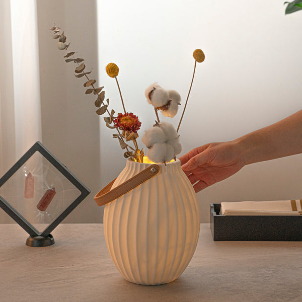 Elevate your décor with our Table Art White Porcelain Lantern / Vase. Featuring an attached handle, this porcelain vase offers easy portability and hanging options, making it perfect for indoor and outdoor use. This flower vase can be paired with candles or LED lights, emitting a soft and gentle glow to create a cozy ambiance. Designed to complement any decor, this decorative vase boasts a classic white color that adds elegance to any room. Made from premium porcelain, this centerpiece vase boasts durability and sturdiness, ensuring long-lasting use at your home or office. The base of this table vase ensures stability and minimizes the risk of tipping over, providing peace of mind in any setting. This white vase can be hand washed to maintain its pristine appearance, facilitating easy upkeep. Measuring 6.25 inches in diameter by 8 inches in height, this white flower vase fits effortlessly into various spaces. Sold in a 1 count box.