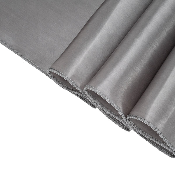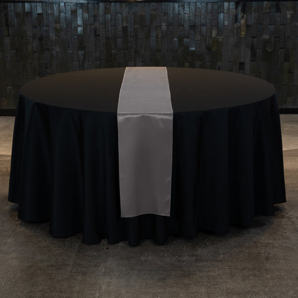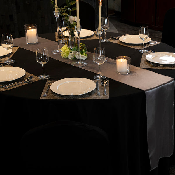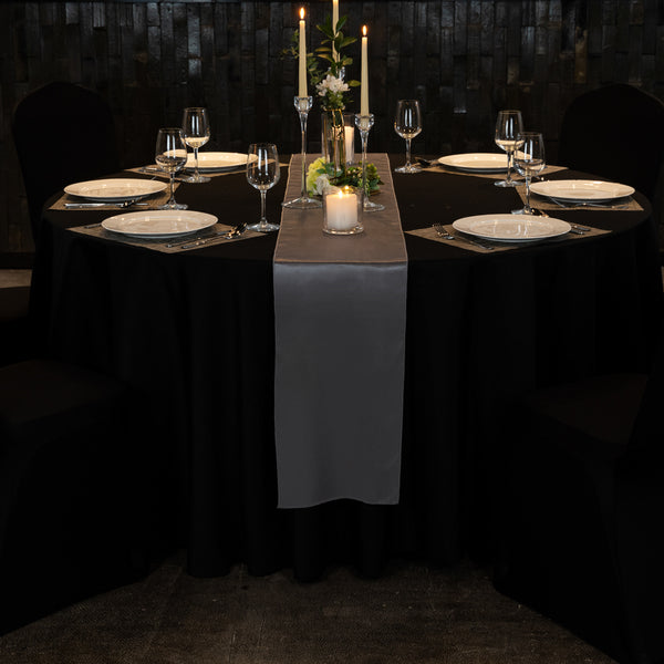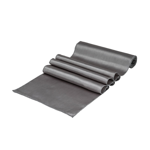 Dress up your table with elegance using our Table Tek Dark Gray Satin Table Runner. This dark gray table runner has a silky appearance and can be used to harmonize or contrast decor. With a one-piece design, this satin table runner doesn't have seams which allow you to create luxurious and memorable table presentations at weddings or fine-dining establishments. This polyester table runner can be machine washed in a gentle cycle with cold water and tumble-dried using medium heat for an easy way to thoroughly clean them after use. It is recommended not to use bleach when cleaning this table runner to prevent damage. This table runner for events measures 108 inches long by 12 inches wide. Sold in a 1 count box.