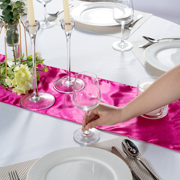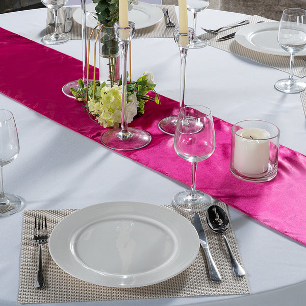 Add the perfect touch to tablescapes using our Table Tek Dark Pink Satin Table Runner. This table top table runner is made from premium polyester and has a dark pink finish and satin weave that complements the ambiance of your event. Featuring a one-piece design, this modern table runner is seamless and allows you to add a luxurious touch to tablescapes. This pink table runner is machine-washable in the gentle cycle with cold water so you can quickly it. To help protect it from wrinkles, this table top runner can be put in a dryer using a medium heat setting. Perfect for setting tables, this modern table runner measures 108 inches in length and 12 inches in width. To maintain their stunning appearance, do not use bleach on this table runner. Sold in a 1 count box.