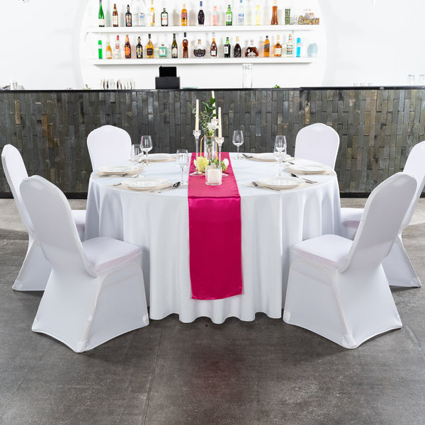 Add the perfect touch to tablescapes using our Table Tek Dark Pink Satin Table Runners. These table top runners are made from premium polyester and have a dark pink finish and satin weave that complements the ambiance of your event. Featuring a one-piece design, these modern table runners are seamless and allow you to add a luxurious touch to tablescapes. These pink table runners are machine-washable in the gentle cycle with cold water so you can quickly wash them. To help protect them from wrinkles, these table top runners can be put in a dryer using a medium heat setting. Perfect for setting tables, these modern table runners measure 108 inches in length and 12 inches in width. To maintain their stunning appearance, do not use bleach on these table runners. Sold in a 10 count box.