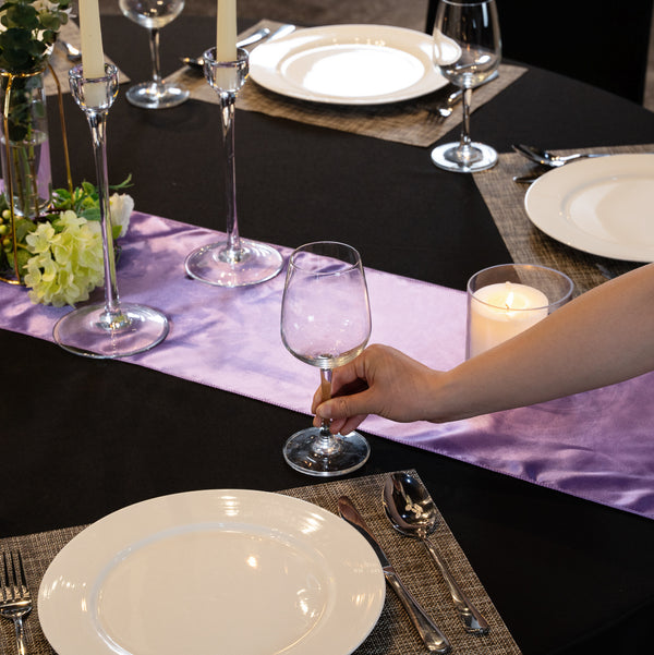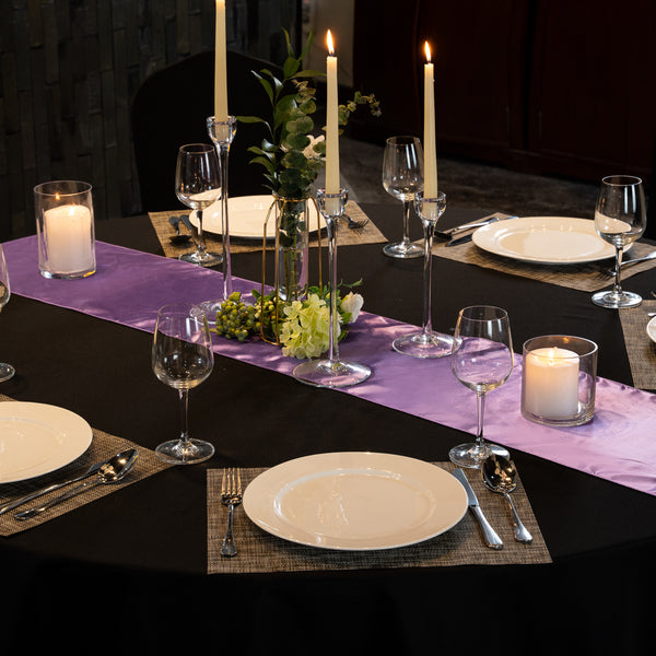 Use our Table tek Lavender Purple Satin Table Runner to provide an astounding look to your table presentation. This purple table runner features a satin finish that complements the hues of tablescapes and adds to the upscale look of your restaurant or catered event. Plus, this lavender table runner can be used to designate seating arrangements at any formal event. With a one-piece design, this satin table runner is seamless to provide your table with a clean and elegant look. This purple runner can be machine washed in a gentle cycle with cold water and tumble-dried using medium heat for quick and easy cleaning when closing your establishment. To preserve its premium appearance and quality, this polyester table runner should not be washed with bleach. This lavender table runner measures 108 inches in length by 12 inches in width. Sold in a 1 count box.