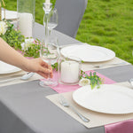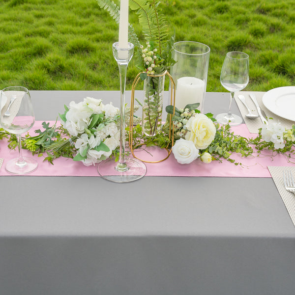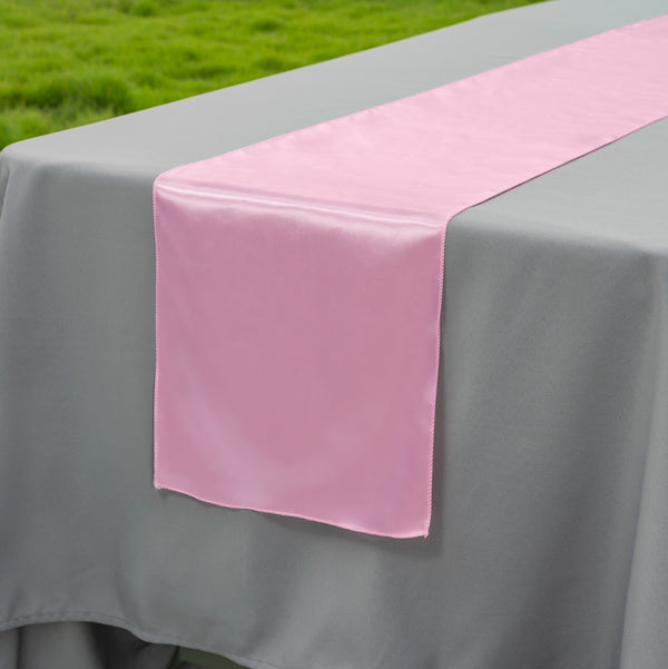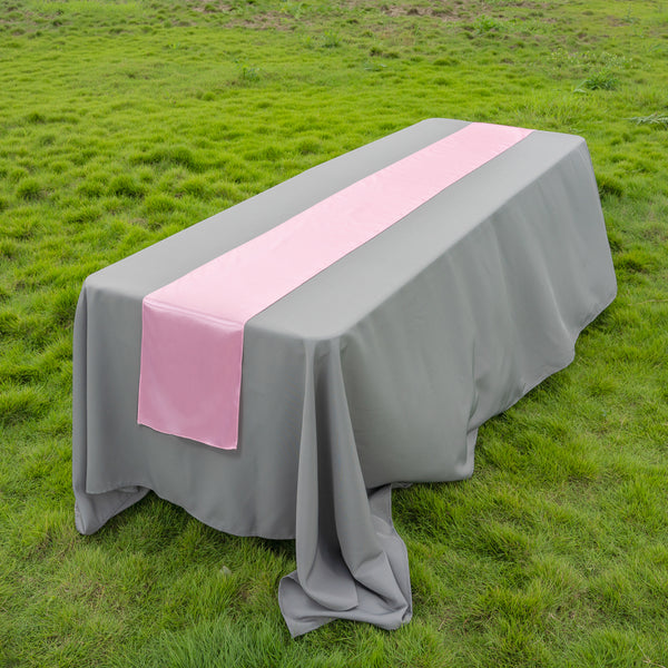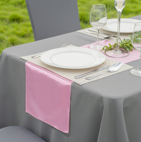Bring elegance to tables at weddings or bridal showers using our Table Tek Light Pink Satin Table Runner. Designed with a light pink finish and satin weave, this party table runner adds a beautiful look to tablescapes and events. Crafted from premium polyester, this wedding table runner has a one-piece design that allows you to quickly put together tables before guests arrive. This seamless table runner is machine-washable in the gentle cycle with cold water for an easy way to clean it after use. To help protect against wrinkles, this wedding table runner can be put in a dryer using a medium heat setting. This light pink table runner measures 108 inches in length by 12 inches in width. Do not use bleach to keep this runner looking new. Shipped in a 1 count box.