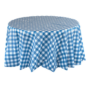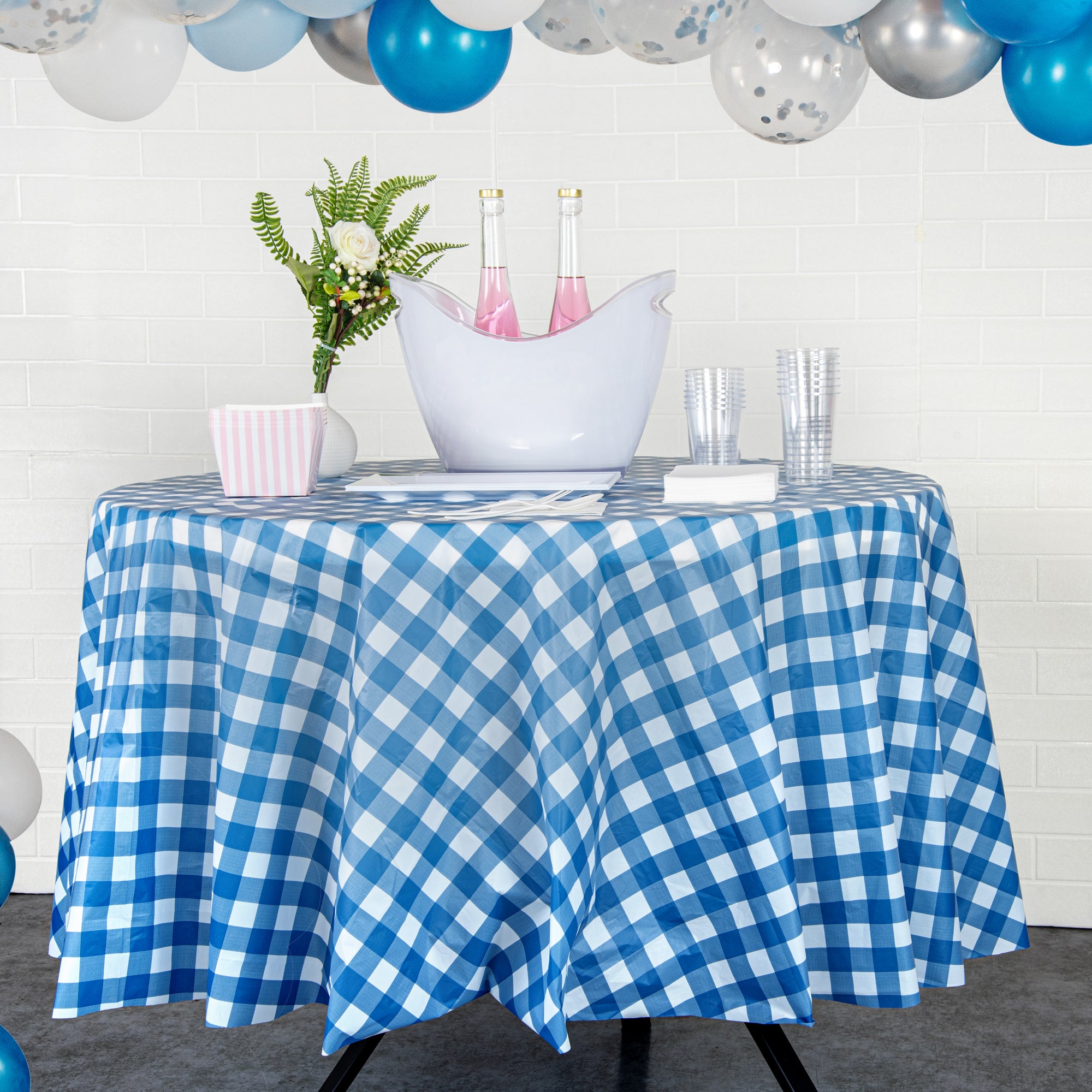 Transform any event with our Table Tek Round Blue Gingham Plastic Table Covers. Perfect for both indoor and outdoor events, these plastic table covers are durable. Showcasing a unique blue gingham print, these disposable table covers provide a chic look that's sure to impress your guests. Crafted from waterproof plastic, these table covers are designed to protect your tables from spills and stains, making clean-up a breeze. With the wrinkle-resistant feature, these table covers always maintain a neat and tidy appearance, ideal for all kinds of events. With a generous diameter of 84 inches, these round table covers are designed to fit a wide range of tables, adding versatility to your event planning. Sold in a 2 count box.