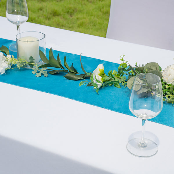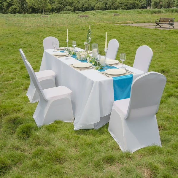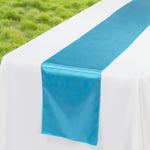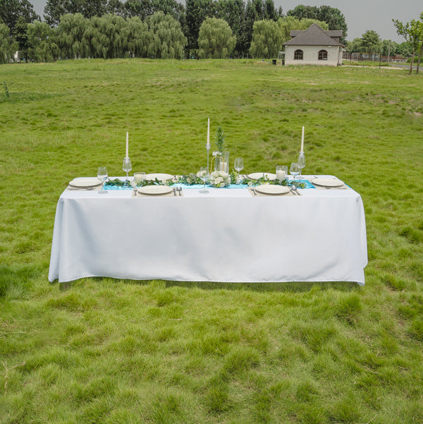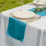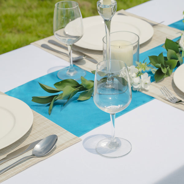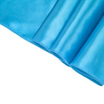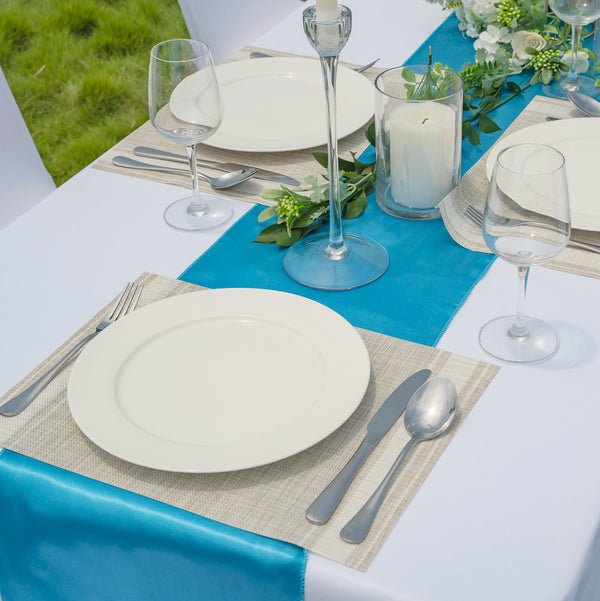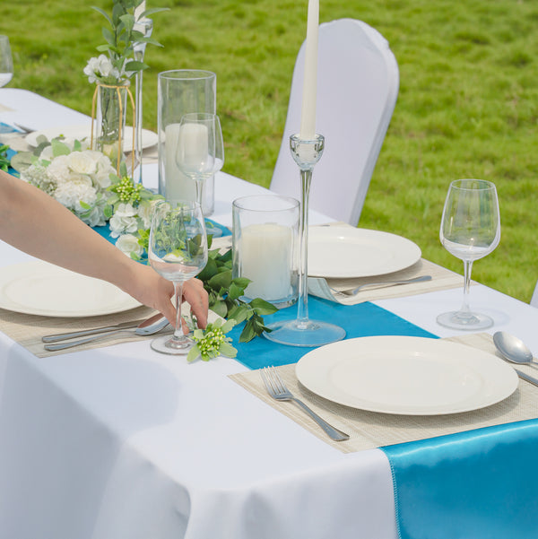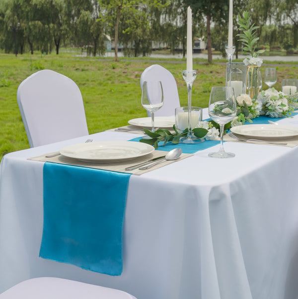 Add a chic touch to any table using our Table Tek Sky Blue Satin Table Runner. Featuring a sky blue finish, this elegant table runner effortlessly adds a splash of color to tables while matching place settings. Made from premium polyester with a satin weave, this sky blue table runner has a glossy look that complements the ambiance at formal events or upscale foodservice establishments. The one-piece design of this satin table runner doesn't have seams to provide a clean look. For easy clean up after events, this glossy table runner can be machine washed in a gentle cycle with cold water and tumble-dried using medium heat. You should not use bleach to clean this satin table runner to preserve its exceptional quality for long-lasting use. This blue table runner measures 108 inches long by 12 inches wide. Shipped in a 1 count box.