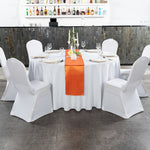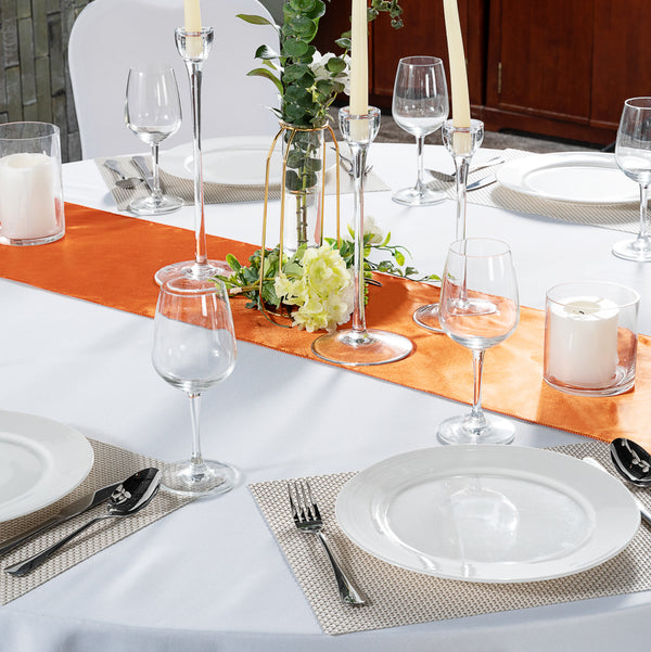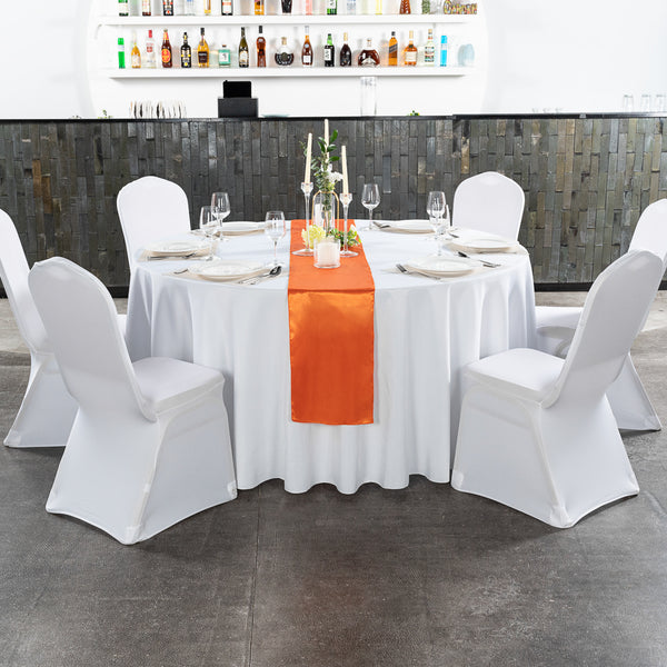 Complement the decorations at your event using our Table Tek Tangerine Orange Satin Table Runner. Made with high-quality polyester, this orange table runner is perfect for everyday use at your restaurant or catered event. Featuring a one-piece design, this dining table runner is seamless and simplifies the process of setting a table. The orange finish and satin weave of this orange runner for table are perfect for matching the decor at your foodservice establishment. Conveniently easy to clean, this orange table runner is machine-washable in the gentle cycle with cold water. This dining table runner can be tumble-dried using a medium heat setting so you can avoid the hassle of ironing. This table runner measures 108 inches in length and 12 inches in width. Do not use bleach on this orange table runner to keep its appearance looking new. Sold in a 1 count box.