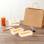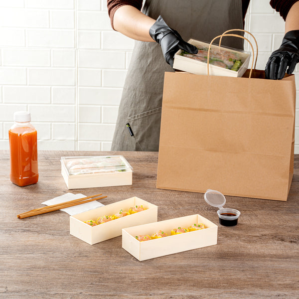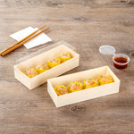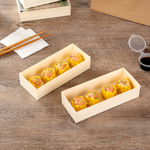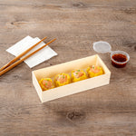 Bring sophistication to your take out and delivery services with our Taipei 18-ounce Rectangle Poplar Long Straight Containers. Constructed from poplar wood, these carry out containers are commercially compostable and biodegradable, serving as eco-friendly alternatives to other carry out containers. The durable construction of these rectangular food containers is suitable for packing various hot or cold food items. With a glassine paper lining, these take out boxes are naturally water-resistant and grease-resistant to prevent sauces from seeping through and creating messes. These disposable to go containers ensure a convenient cleanup. Combine these disposable takeaway containers with their coordinating clear plastic lids (SKU: RWB0389) to keep foods protected and portable. These wooden food containers are shipped flat for convenient storage and equipped with adhesive strips for quick and easy assembly. Containing up to 18 ounces, these take out food containers measure 7.25 inches long by 3 inches wide by 1.5 inches tall, making them perfect for serving sushi rolls, dim sum, dumplings, gyoza, pastries, and more. Sold in a 100 count box. Lids are available and sold separately.