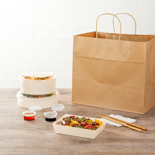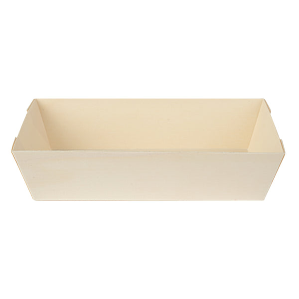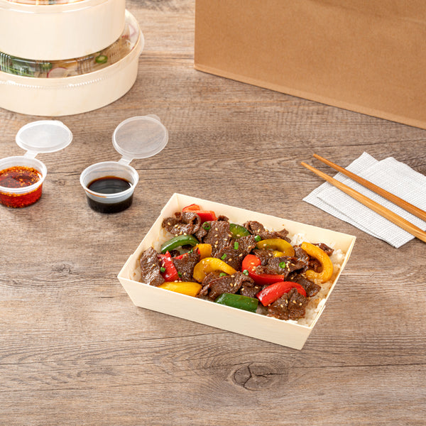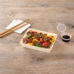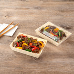 Attractively present your gourmet dishes with our Taipei 20-ounce Rectangle Poplar Short Flare Containers. Featuring glassine paper lining, these takeaway boxes are conveniently water-resistant and grease-resistant, preventing unsightly messes for restaurants, buffets, or catering events. Crafted from poplar wood, a fast-growing resource, these take out boxes are commercially compostable and naturally biodegradable to facilitate a sustainable cleanup. The premium construction of these rectangular take out food boxes makes them ideal for holding the weight of various hot or cold food items. These disposable to go containers are packaged flat for easy storage and equipped with adhesive strips for hassle-free assembly. Take your dishes on the go and pair these carry out containers with their accompanying lids (SKU: RWB0374). These wooden food containers contain up to 20 ounces and measure 6.5 inches long by inches 4.75 inches wide by 1.5 inches tall. Shipped in a 100 count box. Lids are available and sold separately.