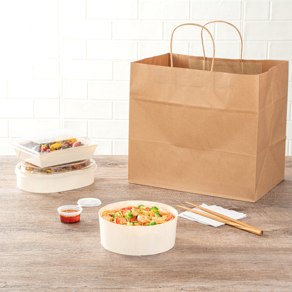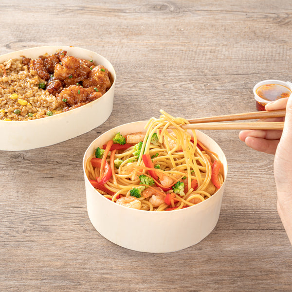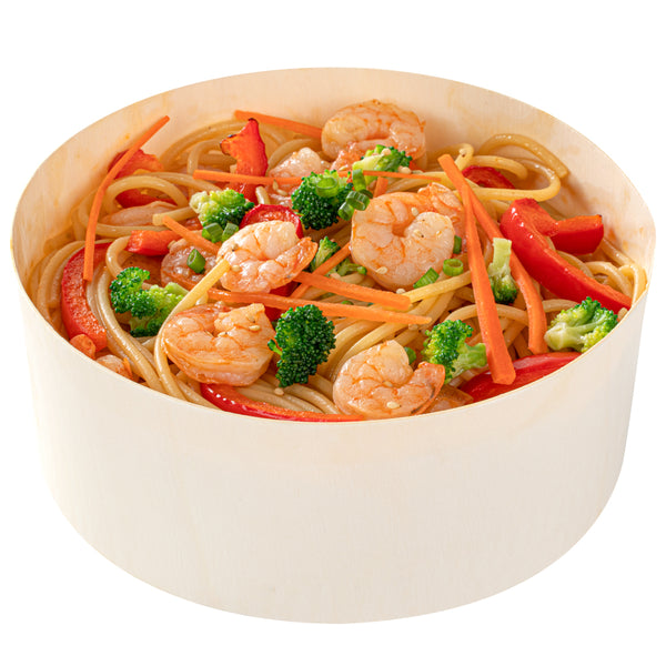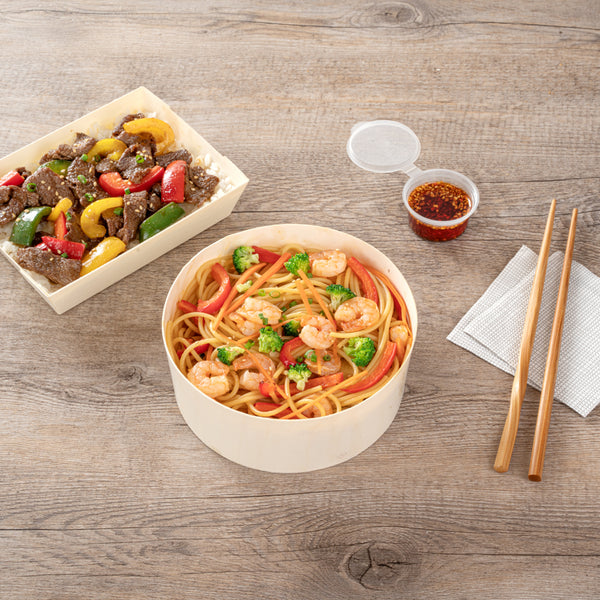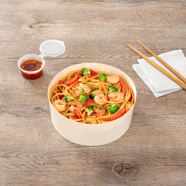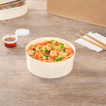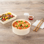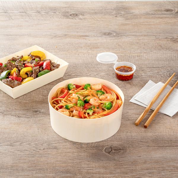 Fashionably store your delectable dishes in an innovative way with our Taipei 34-ounce Round Poplar Deep Containers. Constructed from poplar wood, these disposable to go containers are commercially compostable and biodegradable for a sustainable cleaning experience. Featuring a tough glassine paper lining, these takeaway boxes are conveniently water-resistant and grease-resistant, providing a mess-free serving solution for your appetizers, entrees, and desserts. The sturdy construction of these round take out food containers makes them a perfect choice for serving various hot or cold food items. These wooden food containers feature a stylish round shape that is ideal for serving salads at a sushi restaurant or packaging stir-fried noodles at a Japanese buffet. To securely transport your dishes, pair these take out boxes with their coordinating lids (SKU: RWB0383). Containing up to 34 ounces, these carry out containers measure 6 inches in diameter by 2.25 inches in height. Shipped in a 100 count box. Lids are available and sold separately.