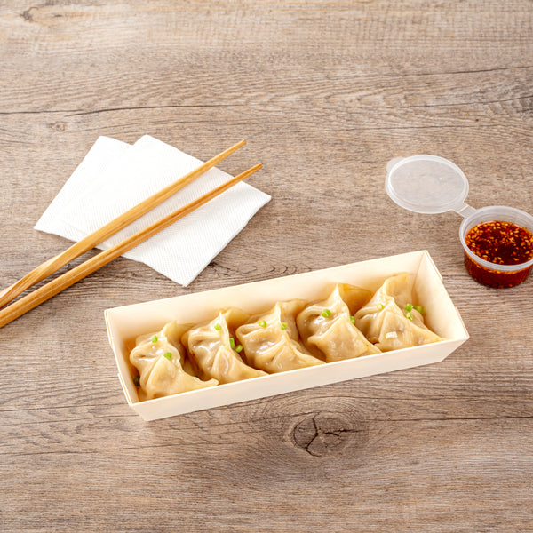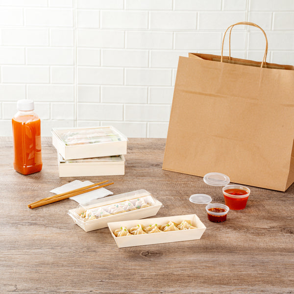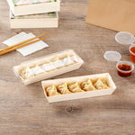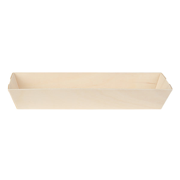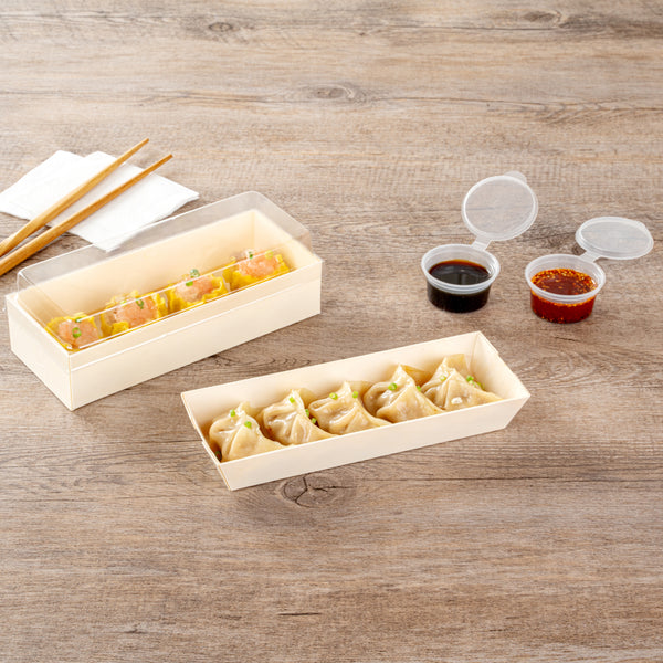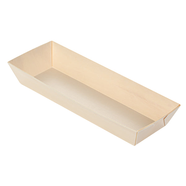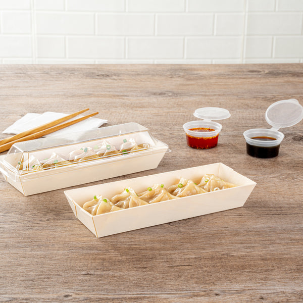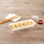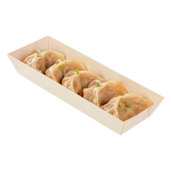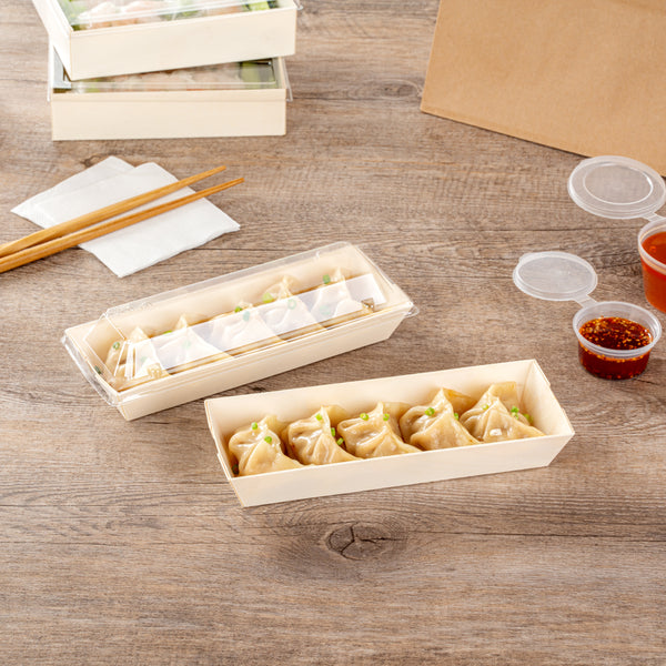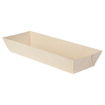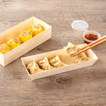 Instantly upgrade the look of your appetizers and desserts with our Taipei 9-ounce Rectangle Poplar Long Flare Containers. Crafted from poplar wood, these carry out containers are commercially compostable and biodegradable for an environmentally friendly cleanup. Featuring sustainable glassine paper lining, these take out food boxes are naturally water-resistant and grease-resistant ensuring mess-free serving at your restaurant, buffet, and catering event. The premium construction of these rectangular take out food boxes makes them suitable for various hot or cold food items. These takeaway boxes are packed flat for convenient storage and equipped with adhesive strips for quick and easy assembly. To securely transport your dishes, pair these disposable to go containers with their coordinating lids (SKU: RWB0376). These wooden food containers measure 7.75 inches long by 2.75 inches wide by 1.25 inches tall and can contain up to 9 ounces. Sold in a 100 count box. These items will only degrade outside of the traditional solid. Lids are available and sold separately.