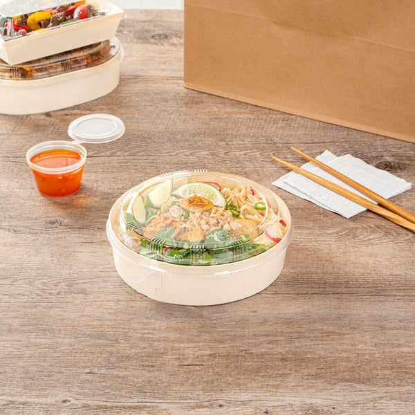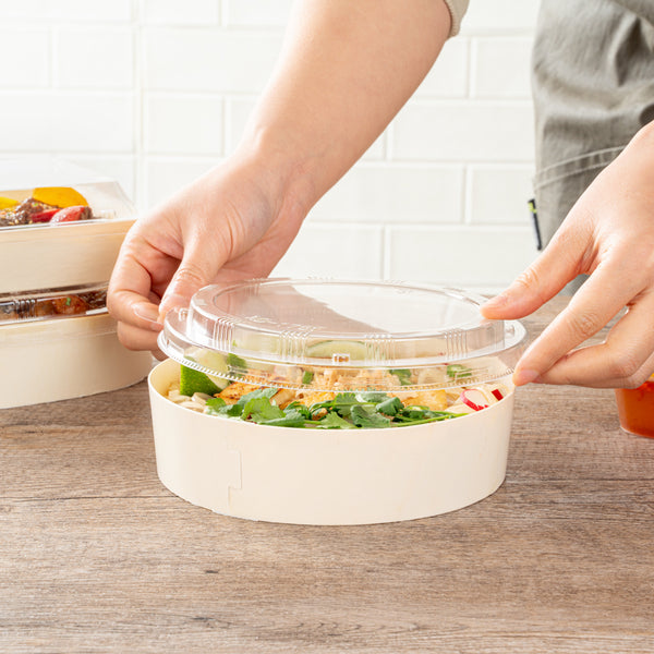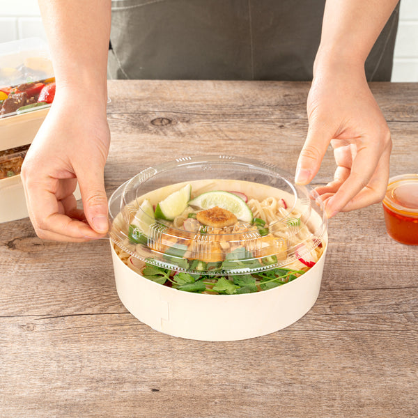 Safely transport your meals with our Taipei Clear Plastic Lids. Made of premium plastic, these transparent lids are designed to withstand regular use and won't crack or warp easily. Couple these clear plastic lids with their matching containers (SKU: RWB0380) for secure sealing to eliminate potential spills and messes while transporting. These durable plastic lids have an elevated roof design that provides ample space for adding various toppings. The transparent finish of these food container lids allows users to quickly view enclosed items without needing to open them. These plastic lids are recyclable to ensure a quick and easy disposal after eating. Each disposable round plastic lid measures 6.25 inches long by 6.75 inches wide by 0.75 inches tall. Shipped in a 100 count box. Containers are available and sold separately.