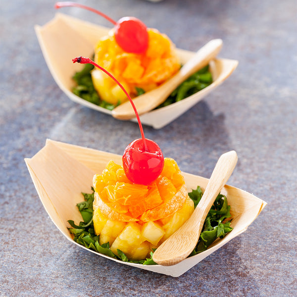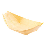 Infuse rustic elegance in your bakery, restaurant, or foodservice setup with our Taipei Natural Pinewood Small Food Tray / Boats. With their sturdy pinewood construction, these biodegradable pinewood boats are durable, providing a reliable foundation for your servings. Offering streamlined cleanup with these disposable small boats that are perfect for expedient events. The natural wood grain pattern of these commercially compostable mini food boats carries an earthy charm, subtly improving your decor. Built for stability, these sustainable food boats are suitable for serving all kinds of foods, from pastries to salads. Measuring 4.5 inches in length by 2.5 inches in width, these pinewood food boats present ample space to serve generous portions while maintaining aesthetic appeal. Shipped in a 200 count box.