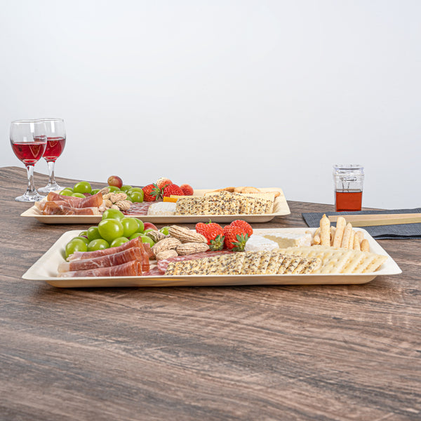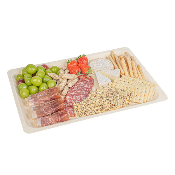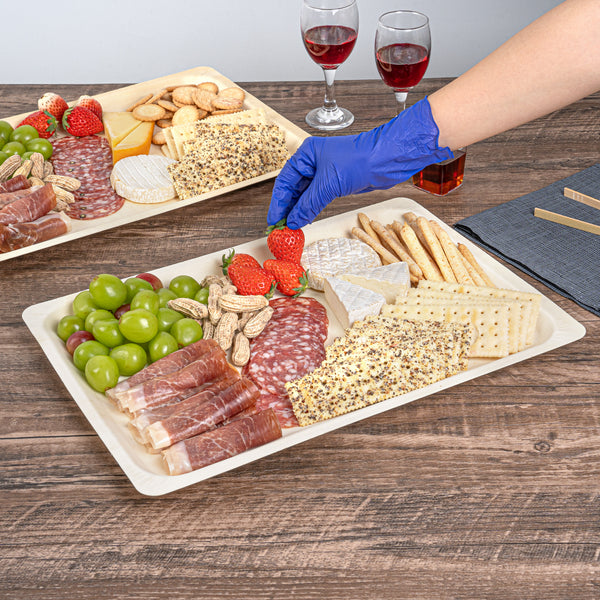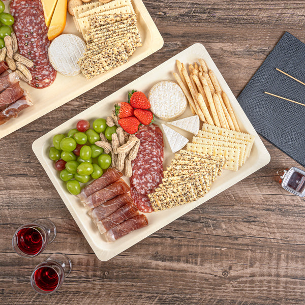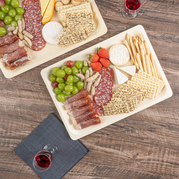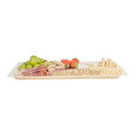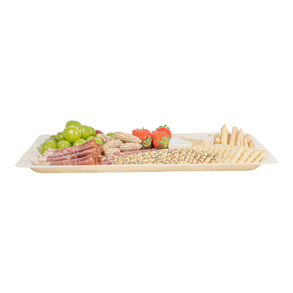 Present your signature fares with our Taipei Rectangle Natural Poplar Plates. These serving plates are crafted from poplar wood and are suited for presenting a diverse range of hot and cold culinary delights. Boasting a greaseproof construction, these party plates ensure your saucy dishes are well-contained without any unpleasant leaks. These disposable plates are biodegradable and commercially compostable, ideal for eco-conscious catering companies and restaurants. The rectangular shape of these serving dishes adds a modern touch to your table setting, creating an elegant presentation for a variety of culinary delights. These disposable dinner plates have a minimalistic neutral finish that effortlessly complements any table decor, adding a touch of sophistication to your dining experience. Ideal for serving generous portions of pasta or other main courses, these food plates measure 15.75 inches in length by 11 inches in width. Sold in a 200 count box. These items will only degrade outside of the traditional solid waste stream.