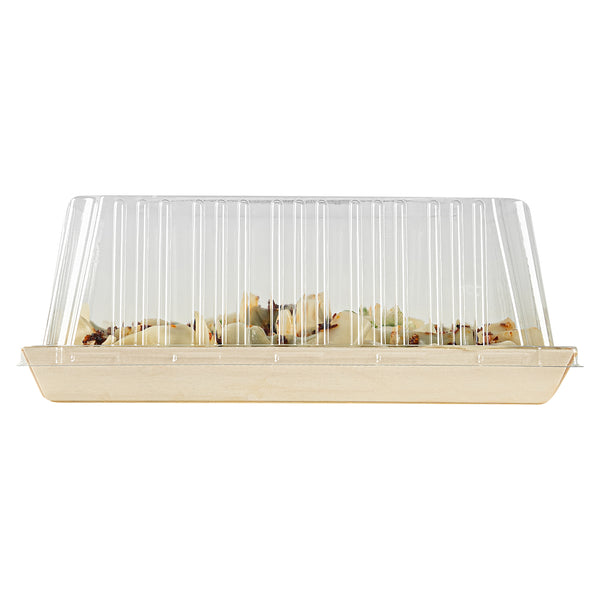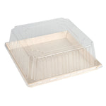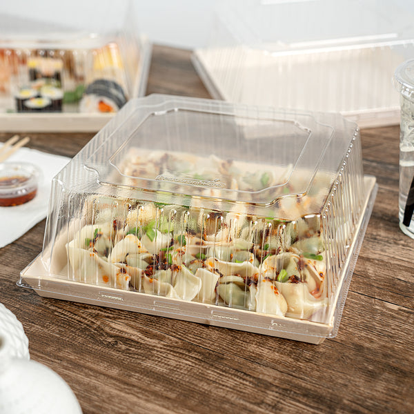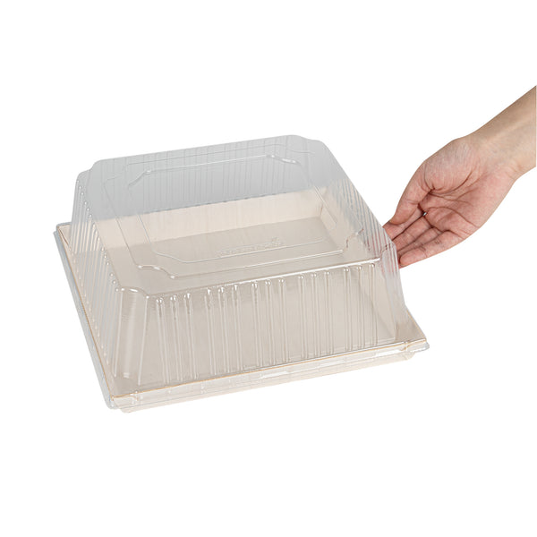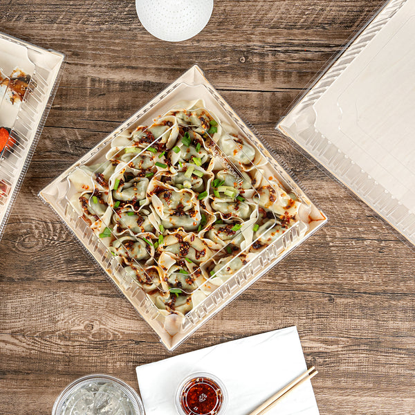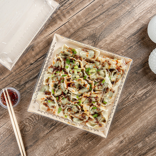 Seal the freshness of your meal with our Taipei Square Clear Plastic Lids. These clear lids are made from PET plastic for premium durability. Pair these plastic lids with its compatible poplar plates (SKU: RWB0596K) for a convenient take out solution. The crystal-clear finish of these square lids offers a glimpse of the delectable contents and adds a touch of elegance to your culinary masterpieces. These plate lids have an elevated roof to provide ample space for toppings or servings to your gourmet creations. Disposable, these clear plastic lids simplify your post-meal cleanup. These square plastic lids measure 9.5 inches long by 9.5 inches wide by 2.75 inches tall. Sold in a 100 count box. Plates are available and sold separately.