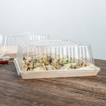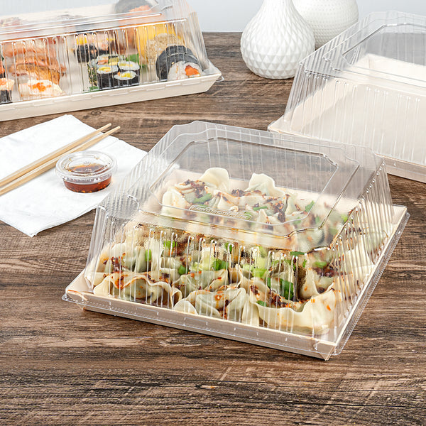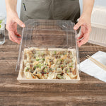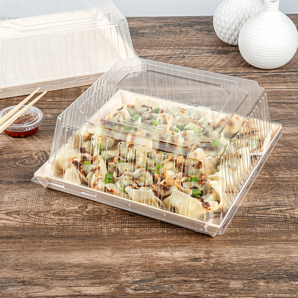 Seal the freshness of your meal with our Taipei Square Clear Plastic Lids. These clear lids are made from PET plastic for premium durability. Pair these plastic lids with its compatible poplar plates (SKU: RWB0596K-25) for a convenient take out solution. The crystal-clear finish of these square lids offers a glimpse of the delectable contents and adds a touch of elegance to your culinary masterpieces. These plate lids have an elevated roof to provide ample space for toppings or servings to your gourmet creations. Disposable, these clear plastic lids simplify your post-meal cleanup. These square plastic lids measure 9.5 inches long by 9.5 inches wide by 2.75 inches tall. Sold in a 25 count box. Plates are available and sold separately.