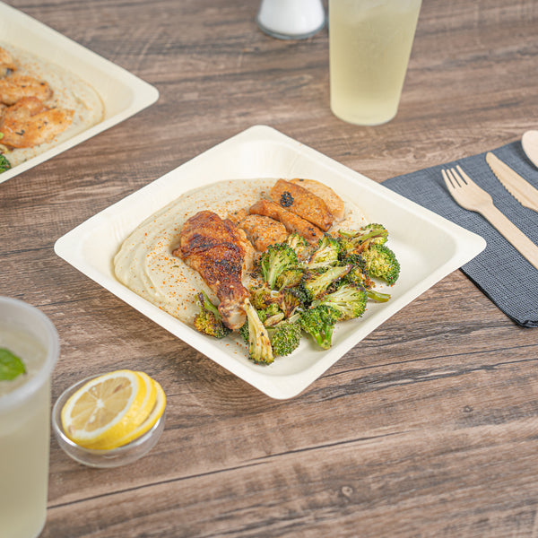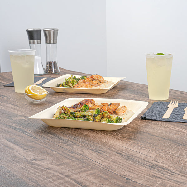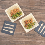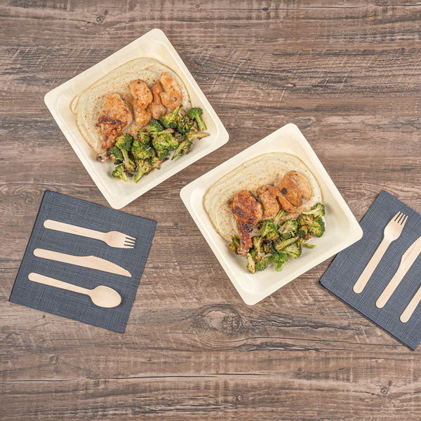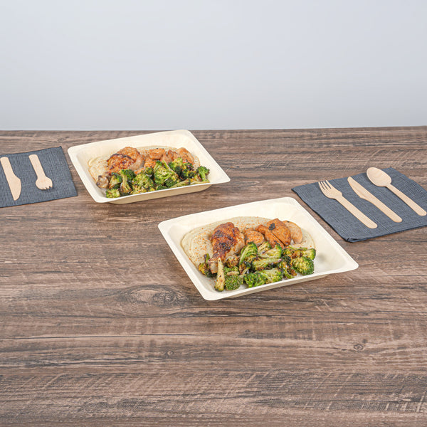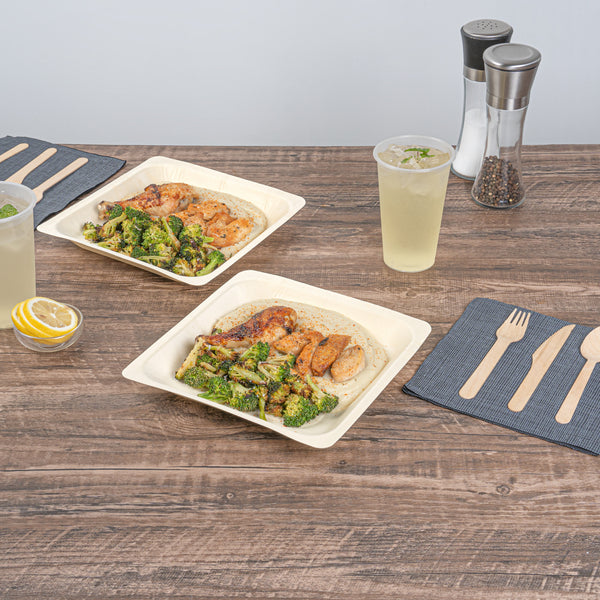 Serve savory noodles with our Taipei Square Natural Poplar Plates. Made of sturdy poplar wood, these party plates can carry hot and cold dishes such as piping hot pasta to chilled fruit salads. Featuring a greaseproof design, these disposable plates are suitable for serving saucy dishes without any worry of leaks. These serving plates are biodegradable and commercially compostable, ideal for eco-conscious foodservice establishments looking to minimize their environmental impact. The modern square design of these serving dishes enhances the appeal of your food, adding a contemporary touch to your presentation. These pasta plates feature a neutral finish, providing a versatile backdrop for showcasing your favorite dishes. Each food plate measures 9 inches in length by 9 inches in width by 1 inch in height. Sold in a 200 count box. These items will only degrade outside of the traditional solid waste stream.