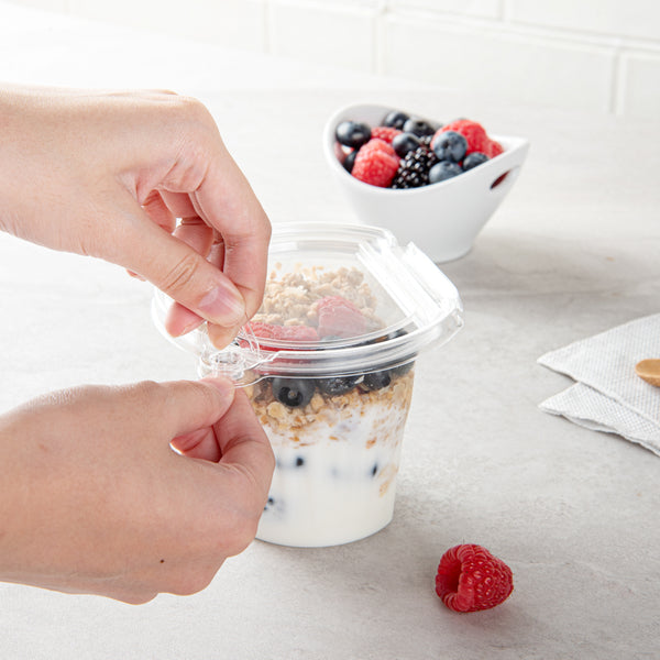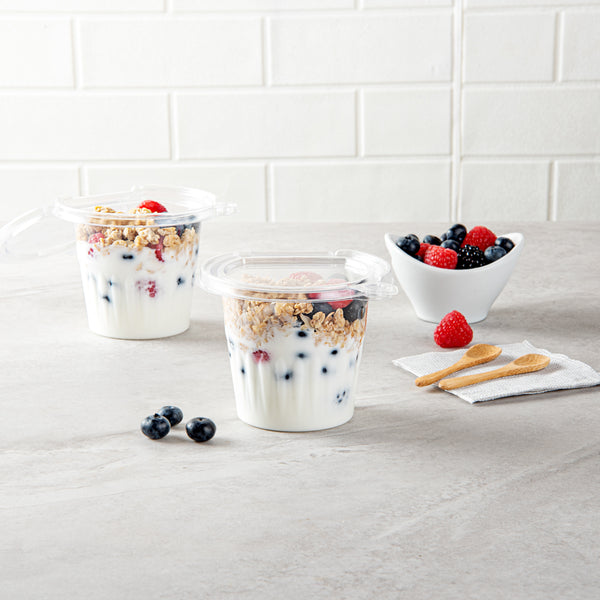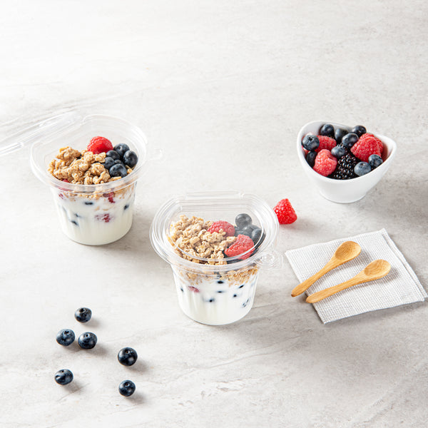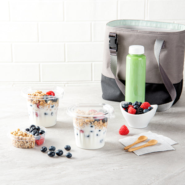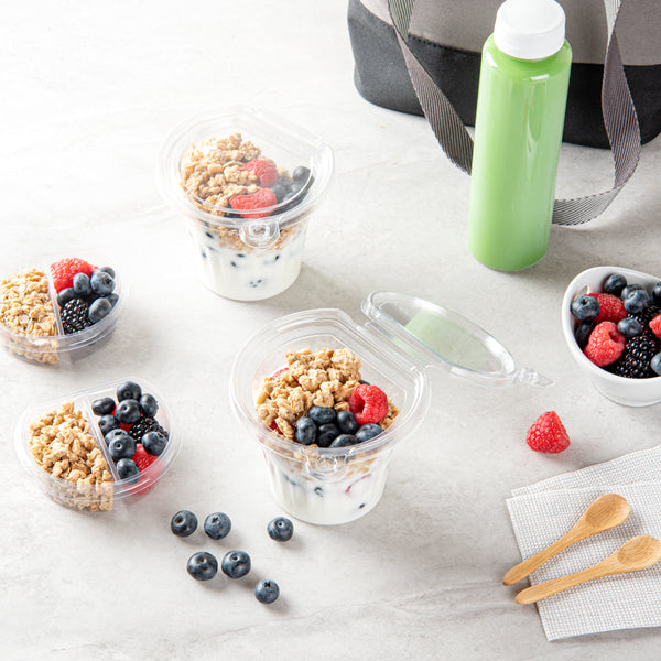 These insert trays with two compartments perfectly fit inside our 11-ounce, flat-sided parfait cups to carry more toppings. Optimize to-go desserts!