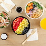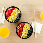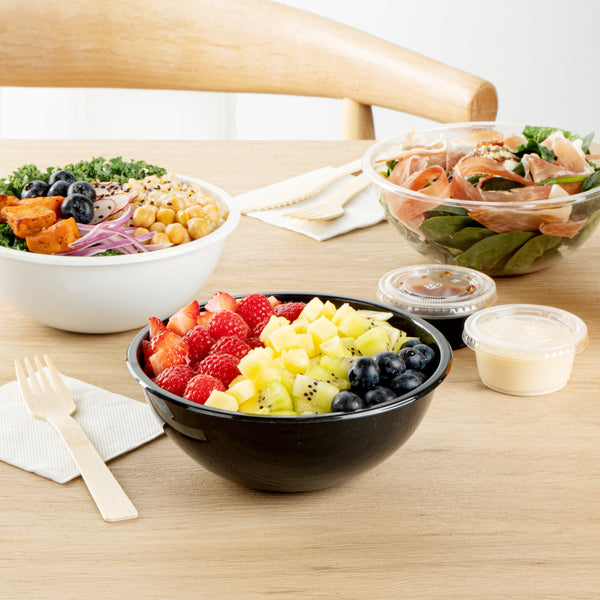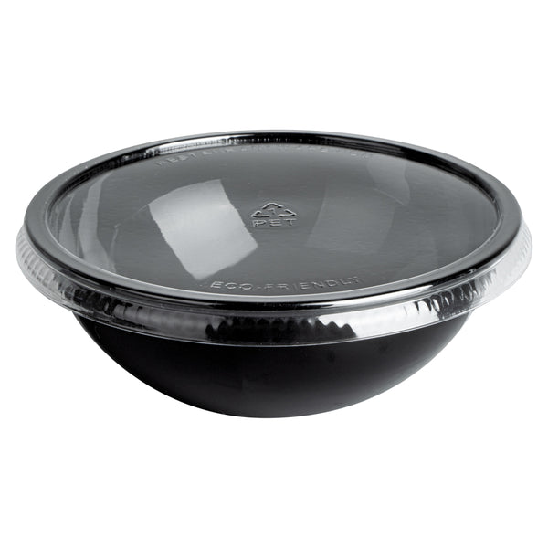 Serve fresh salads with our Tamper Tek 18-ounce Round Black Plastic Salad Bowls. Crafted from high-quality plastic, these plastic salad bowls feature sturdy walls and a strong base to support hefty portions of salad, pasta, or mixed vegetables. Their round shape instantly brings a traditional look to table settings, while their black finish effortlessly completes the look of any dish. Coordinate these black salad bowls with our Tamper Tek clear lids (SKU: RWP0206C) to prevent messes during take out or delivery services. These disposable serving bowls are conveniently recyclable to streamline your cleaning process at your cafeteria, buffet, restaurant, or other foodservice establishment. Containing up to 17.6 ounces, these plastic bowls measure 6 inches in diameter by 2.5 inches in height. Sold in a 200 count box. Clear lids are available and sold separately.