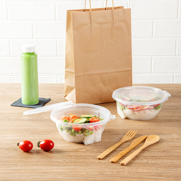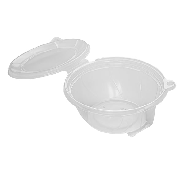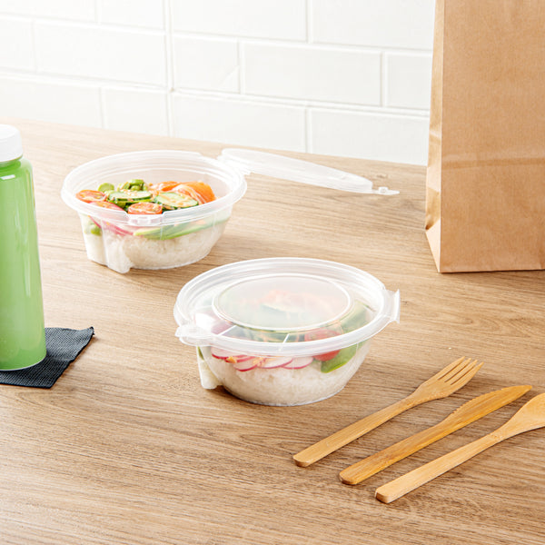 The tamper-evident design of these clear bowls with lids protects the food inside from getting tampered with. The hinge breaks off once opened to alert you of possible tampering.