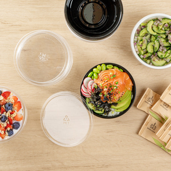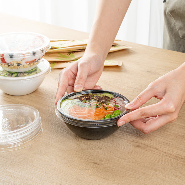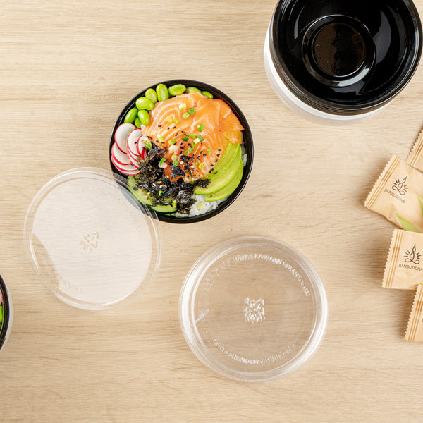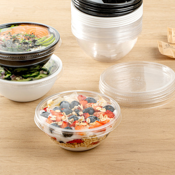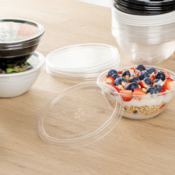 Safely secure all kinds of salads and sides using our Tamper Tek Round Clear Plastic Lids. These plastic bowl lids are designed to neatly fit our Tamper Tek 7-ounce salad bowls (SKU: RWP0203B, RWP0203C, RWP0203W). Made from premium plastic, these clear lids are recyclable, for an easy and eco-friendly way to dispose of meals. With a tight-fitting seal, these plastic lids latch onto the rim of our Tamper Tek salad bowls to ensure that foods won’t leak or create messes during transport. These plastic bowl lids are crack-resistant to avoid bending or breaking during use. Ideal for restaurants, cafes, bakeries, or other foodservice establishments, these clear lids are conveniently stackable to save storage space in any kitchen. Measuring 4.9 inches in diameter and 0.5 inches in width, these plastic bowl lids are sold in a 200 count box. Bowls available and sold separately.